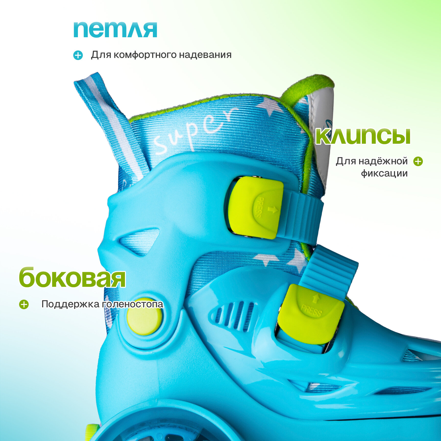 верхняя бакля, защита в комплекте, коньки-ролики, раздвижные, с тормозом, светящиеся колеса, сумка-переноска в комплекте, съемный внутренник, шлем в комплекте