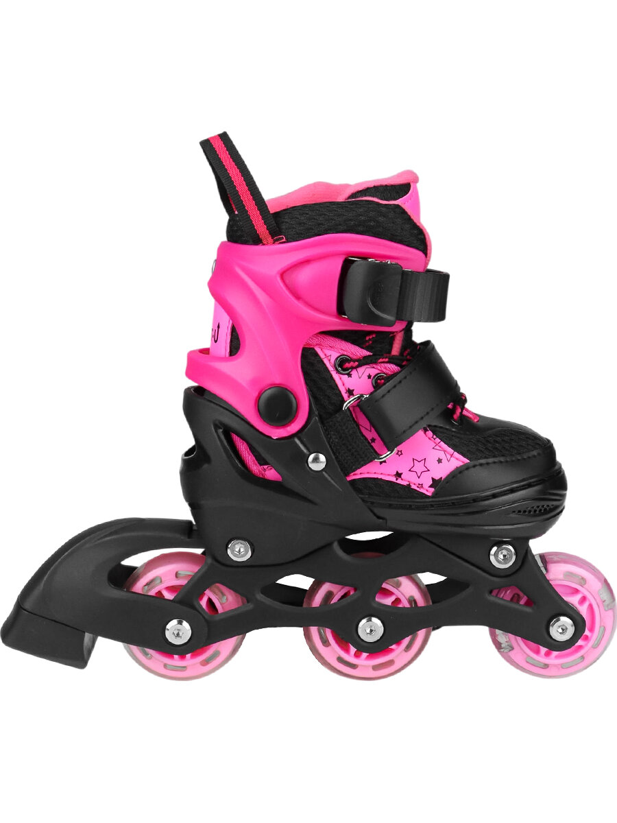 Купить ролики для лета и ледовые коньки для зимы получается накладно для кошелька. Данная модель - выход из сложившейся ситуации, ведь она сочетает в себе роликовые и ледовые коньки. Такому подарку будут рады не только дети, но и родители, ведь коньки будут "расти" вместе с ребёнком. С таким инвентарём чадо сможет разнообразить привычный досуг, а также улучшить координацию, развить пластику движений, правильно сформировать мышечный корсет и, конечно же, обрести новых друзей. Материал ботинка: полипропилен; ПВХ; материал подкладки: ткань; материал лезвия: нержавеющая сталь. Размер: 33-36. Цвет: розово-чёрный. Упаковка: гофро-короб.
