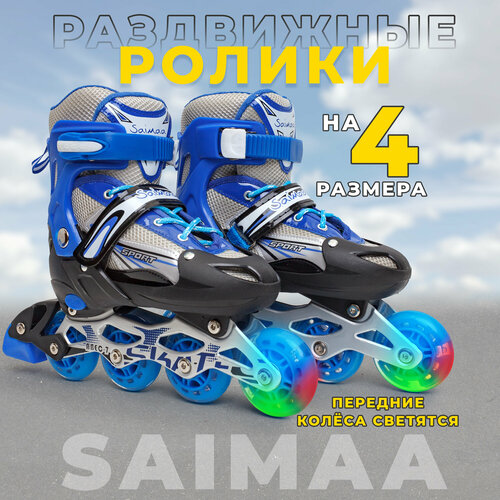 Яркие раздвижные роликовые коньки Saimaa 905PU на алюминиевой раме с четырьмя колесами изготовленными из износостойкого полиуретан. Подшипники АВЕС 7 обеспечивают прекрасный накат и устойчивы к ударным нагрузкам. Первое колесо светящееся, на одном ботинке установлен тормоз, что очень важно для начинающих роллеров. Ролики плотно сидят на ноге, благодаря 3-м видам крепления: пяточный ремень, шнуровка и клипса, так же они надежно защищают голеностоп. Увеличение размера происходит плавно : для подстройки длины ботинка достаточно нажать специальную кнопку PUSH, потянуть за край и зафиксировать в нужном положении. При раздвижении ролика, размер стельки остается прежним, раздвигается сам ботинок. Наши ролики подойдут, как для начинающих роллеров, так и для тех, кто уже освоил катание на роликах. Раздвижные ролики выполнены в 4 расцветках, подойдут как для мальчиков, так и для девочек возрастом от 5 лет.