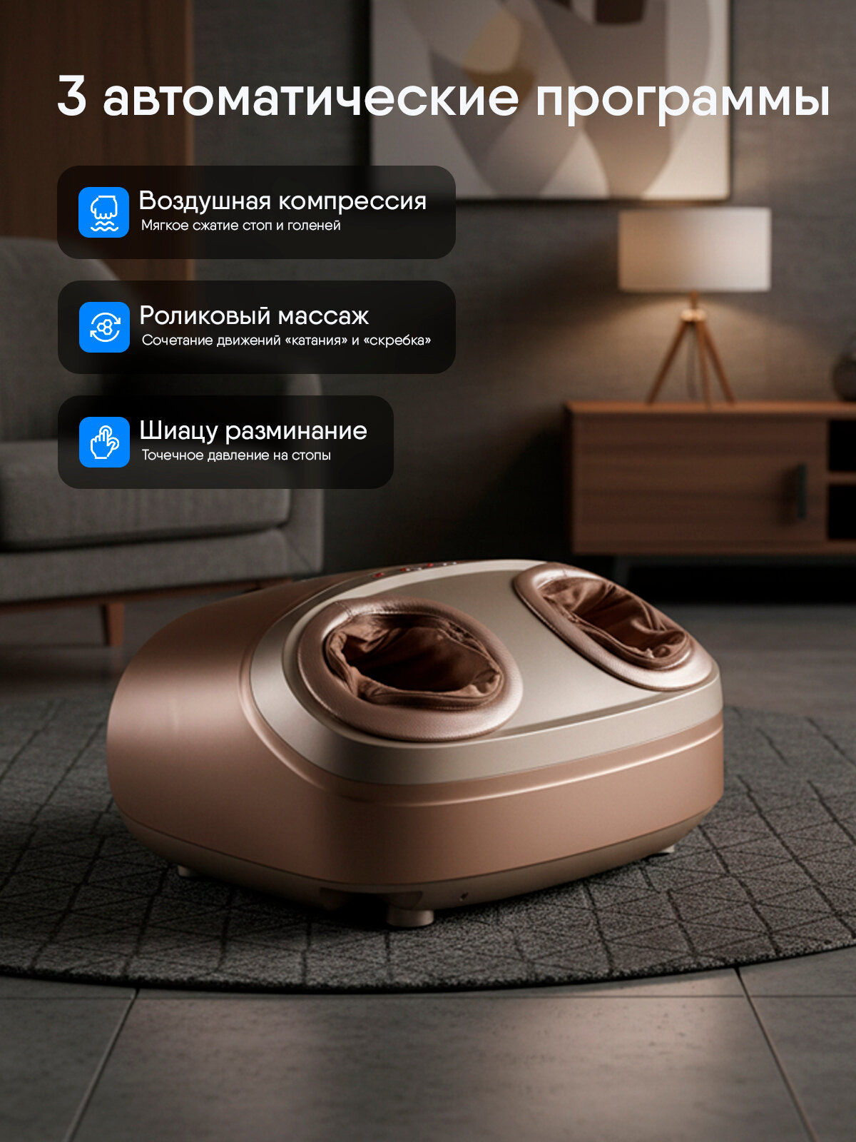 Ergonova Feelfoot2 – идеальный массажер для ног. Инновационный массажный механизм Quick Relax позволяет совмещать сразу несколько видов массажа: массаж шиацу, разминающий, роликовый и воздушно-компрессионный 3D массаж ног. C функцией инфракрасного прогрева. Не меняйте свои планы! -Напряжение накапливается, но ритм большого города заставляет успевать всё! -Подражая разминанию и давящим движениям профессионального массажиста, Feelfoot 2 помогает снять накопившуюся усталость в ногах и щиколотках. -Благодаря массажным роликам Feelfoot 2 мгновенно снимает болезненный синдром в ногах, восстанавливает ваши силы и дарит необыкновенное расслабление. -Не откладывайте свои увлечения до лучших времён и будьте здоровы вместе с Feelfoot 2! При более тяжелых случаях или заболеваниях, мы рекомендуем вам обратиться за профессиональной консультацией к врачу. Личный массажист у вас дома Quick Relax Каждая стопа массируется при помощи 3-х вращающихся массажных роликов и 2-х воздушных подушек. Ролики перемещаются в различных направлениях под управлением микроконтроллера. По ощущениям это похоже на массаж пальцами рук массажиста. 3 массажных программы: -Восстановление Интенсивный массаж поможет вернуть ваши ноги к жизни. От усталости нет и следа. Вы снова полны энергии и снова готовы ходить. -Безмятежность Поможет вашим ногам расслабиться и снять глубинные блоки после тяжелого дня. -Тонус Укрепляет мышцы, улучшает кровообращение и предотвращает накопление токсинов, делая ноги здоровыми и красивыми. Нет времени на массаж? Массаж полезен для людей с большим стрессом и занятостью. Массажер - альтернатива походу на процедуры. Вы можете насладиться массажем, сидя дома на диване, отдохнуть от будничной нагрузки или просто расслабиться.