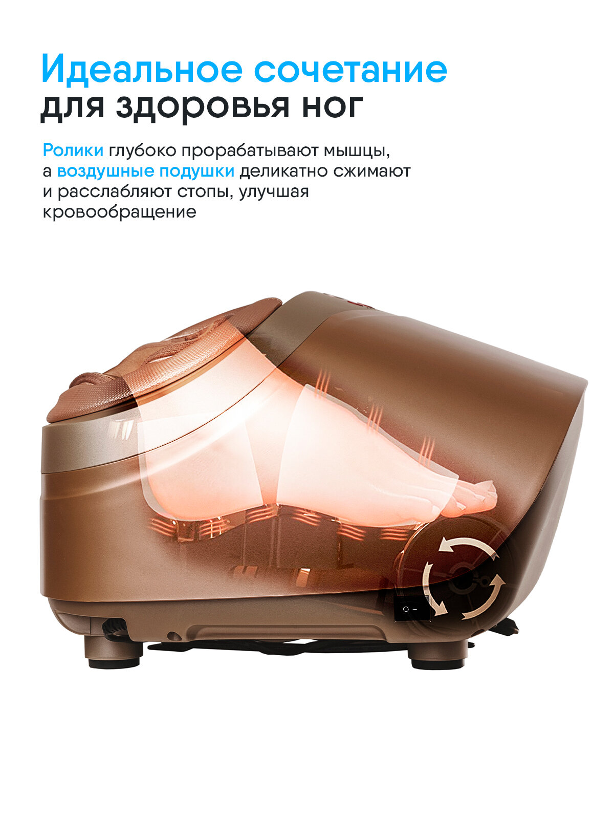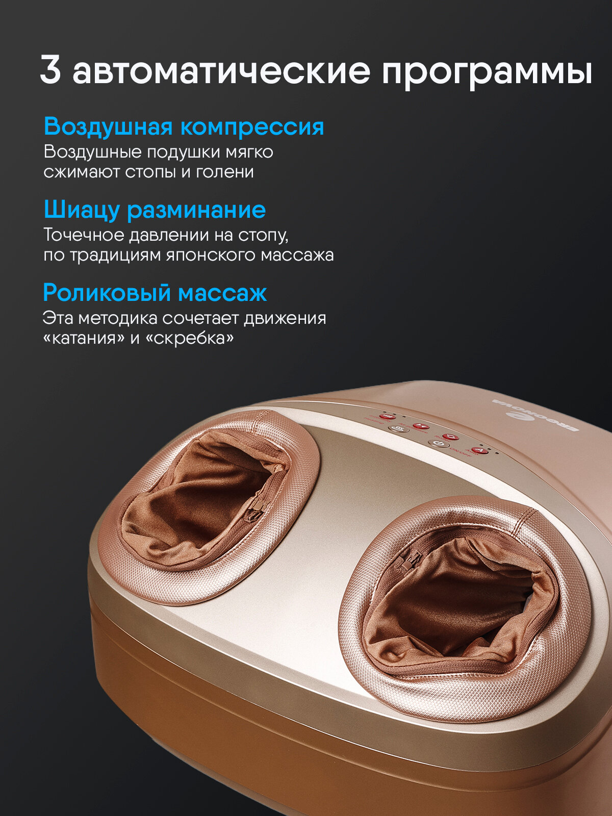 Знакомьтесь: массажер FEELFOOT2 - для ежевечернего релакс-массажа ваших ступнейне бросайтесь к плите, как только попадете домой после работы. Разденьтесь и включите FeelFoot. Вам нужно всего 15 минут для себя, чтобы успокоиться после суматошного рабочего дня. особенности: интеллектуальный воздушно-компрессионный 3D-массаж ног, создающий ощущение массажа у настоящего массажистароликовый массаж стоп, имитирующий хождение по галечному пляжумассаж Шиацу- воздействие на биологически активные точки на стопе3 автоматические программы для снятия напряжения и усталости. взбодритесь ИЛИ расслабьтесь С FEELFOOT2 - 15 минут массажа вместо нескольких часов снарасслабьтесь и ощутите легкость в ногах с 3 автоматическими программами: Программа № 1 (красный огонек): Точечный + роликовый + воздушный массаж. Ваши пяточки на глазах становятся розовыми, как у младенца: с FeelFoot вы улучшаете циркуляцию крови и лимфатический и венозный отток. Если совмещать массаж с пилингом и педикюром, то уже через несколько процедур ваши ножки станут такими же гладкими, как у гейши. Программа № 2 (желтый огонек): Разминающий массаж. Разминает ваши уставшие ступни и пальчики на ногах. Пусть ваши ноги отдохнут: снимите напряжение и успокойте мышцы ног. Будьте безмятежны с FeelFoot. Программа № 3 (синий огонек): Роликовый + воздушный массаж ног. Закройте глаза и почувствуйте, как приходит в норму повышенное кровяное давление, уходит головная боль и возвращаются силы. Отдохните 15 минут. Вам нужно всего 15 минут на массаж. Прямо у вас дома. Или в офисе, если у вас там домашняя обстановка. Никуда не едьте: приводите свои ножки в тонус за просмотром телевизора или пролистыванием журналов. Блаженствуйте с FeelFoot. Работает без воды. Наверняка у вас когда-то была массажная ванночка для ног. Возможно, она и сейчас пылится у вас на шкафу. Помните, почему вы включали ее всего раз пять после покупки? Потому что она ничем не лучше обычного тазика: принеси воды, налей, а после массажа - вылей, стараясь не расплескать, а потом помой эту громадину. Помня о таких сложностях, в следующий раз вы не очень-то и хотели лишний раз ее включать. Легкий FeelFoot удобно переносить из комнаты в комнату: в нем есть выемки для рук, чтобы быстро схватить массажер и поставить его в другое место. С FeelFoot всё просто: включите в сеть, нажмите на кнопку ON и выберите нужную программу. Устройтесь поудобнее и поговорите с мужем о делах на работе или позвоните маме. Регулируйте интенсивность с помощью кнопки Intensity. Через 15 минут сеанс массажа окончен: надевайте тапочки и займитесь домашними делами. Или ходите по дому босиком, если вы так привыкли. Вам не нужно выливать воду и мыть массажер: просто выключите его и отправляйтесь ужинать. Вы чувствуете себя такой же отдохнувшей и полной сил, как после правильной медитации или долгого крепкого сна. Не нужно никого просить. Вашим близким редко удаётся выкроить время для того, чтобы помассажировать вам ножки. С FeelFoot вы обретаете свободу: просто включите массажер и наслаждайтесь отличным массажем. У вас не будут ныть пальцы на руках от того, что вы слишком энергично разминали ступни. Проверяйте почту, гладьте кошку или подпиливайте ногти, пока FeelFoot снимает усталость ваших ног и приводит в порядок каждый сустав. Купите FeelFoot, чтобы каждый вечер чувствовать легкость в ногах. носите шпильки, потому что у ва