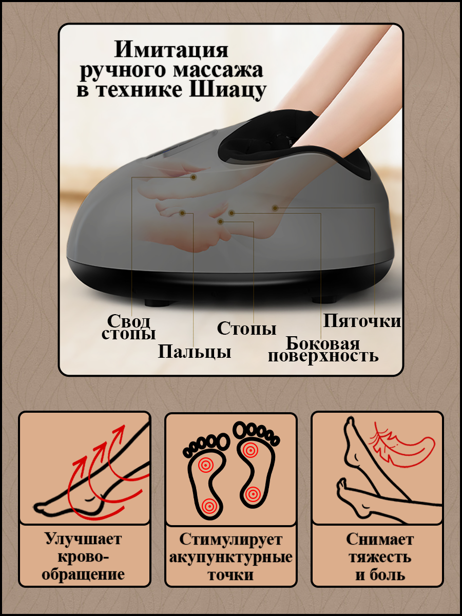 | Дополнительная информация | Массажер для ног - инновационное устройство, специально разработанное для обеспечения максимального комфорта и снятия болевых ощущений. Благодаря роликовой системе и электрической функциональности, этот массажер станет вашим незаменимым помощником в улучшении кровообращения и расслаблении мышц стоп ног. Компактный и многофункциональный, он позволяет вам наслаждаться качественным массажем в любое время, не прибегая к услугам массажиста и высоким затратам. Аппарат удобен в использовании и обладает возможностью настройки интенсивности массажа , вибрации, компрессии и функции подогрева под ваши индивидуальные потребности. Встроенный подогрев - это идеальное решение для любого времени года! Вы будете наслаждаться теплом и приятным ощущением расслабления усталых ног. Такой массажный аппарат - ваш ключ к здоровым и красивым ногам! Используя этот массажер, вы обеспечите достаточное количество сенсорных стимуляций и активируете нервные окончания в области стопы. Его уникальный дизайн и технологичность позволяют достичь максимального результата и удовольствия от использования. |
