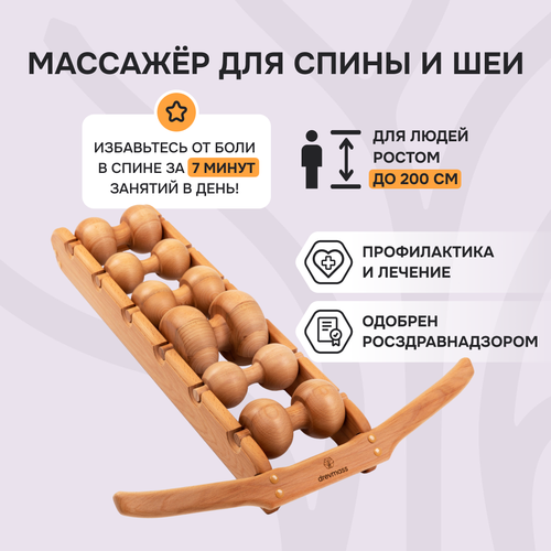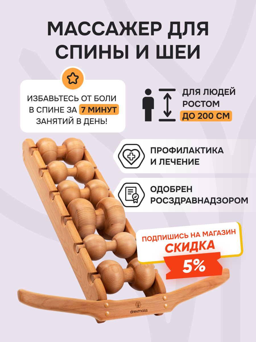 Массажер Drevmass из бука с 6 роликами предназначен для ежедневного самомассажа и ухода за позвоночником. Уникальная конструкция массажера позволяет плавно вытянуть позвоночник, снять напряжение и вывести мышцы из спазма, обеспечивая релаксацию и облегчение.