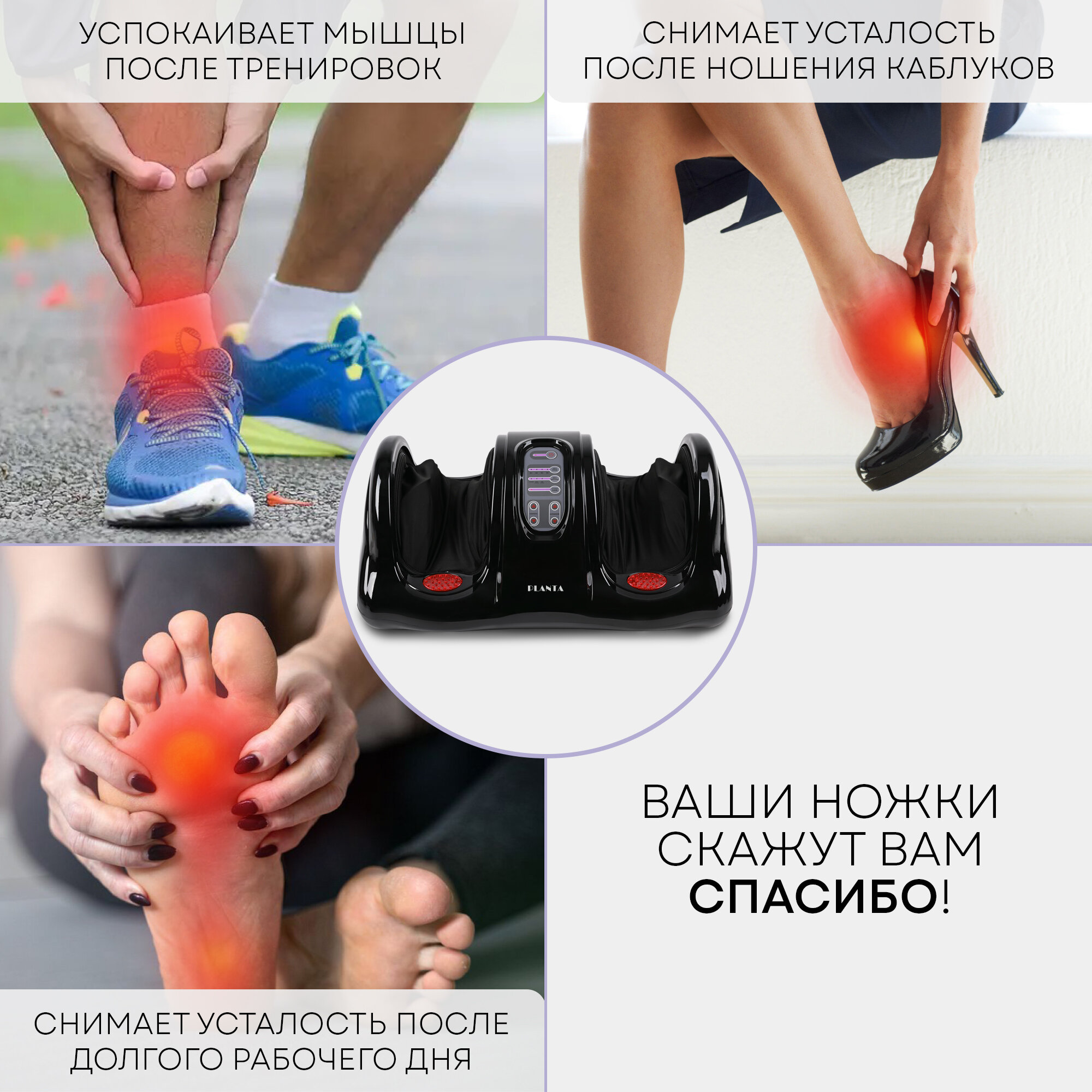 Массажер для ног, рук и икр Planta MF-9 – современный способ расслабления, восстановления и снятия напряжения с усталых мышц ног, икр и рук. Сочетая новейшие корейские технологии и традиционные методы восточной медицины, массажер воздействует на акупунктурные точки тела. Во время массажа происходит воздействие сразу на обе стопы, охватывая их с трех сторон и создавая 3D-эффект – разминающий массаж с проработкой массажными роликами Шиацу. Акупунктурные накладки на корпусе предусмотрены для охвата всей площади стопы и усиления эффекта от массажа. При помощи удобного пульта управления Вы можете не только настраивать программы и устанавливать желаемое положение массажных роликов, но и выбрать в индивидуальном режиме скорость и направление. Имеются 4 автоматические программы.