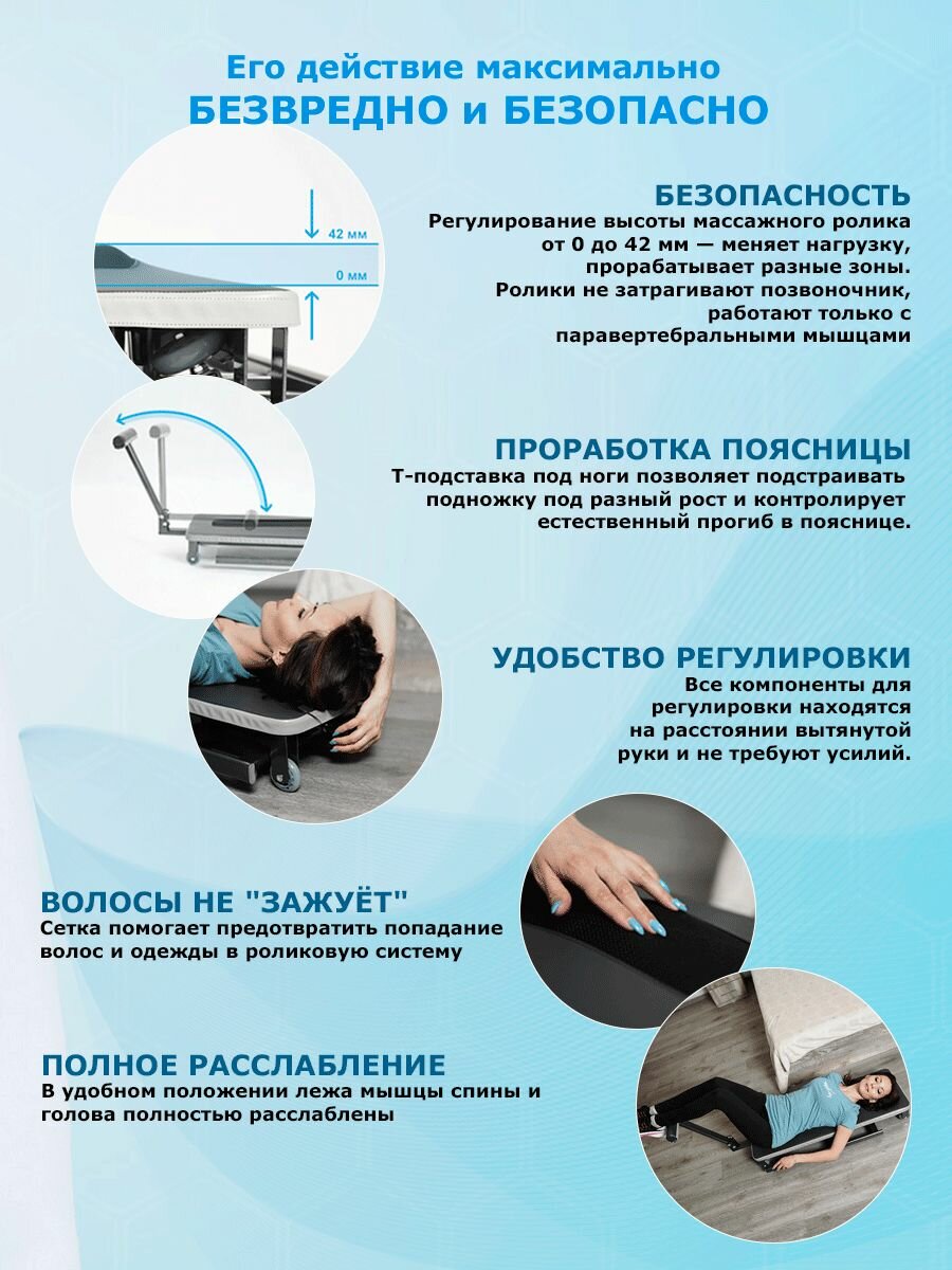 Позвольте своему позвоночнику вздохнуть свободно! Массажер-тренажер маст — это ваш ключ к здоровой спине . Он подходит для всех: людей с сидячей работой людей с тяжелыми физическими нагрузками людей с проблемами с осанкой пенсионеров и всех, кто заботится о своем здоровье! Всего 15 минут в день, и вы почувствуете разницу: Избавление от боли и дискомфорта в спине. Улучшение осанки и снижение риска развития остеохондроза. Снижение риска грыжи и коррекция сколиоза. Восстановление гибкости и подвижности позвоночника. Укрепление мышц спины и улучшение кровообращения. Снятие мышечного напряжения и спазмов. Улучшение кровообращения головного мозга. Освобождение от тяжести и усталости в ногах благодаря массажной подножке. Принцип действия массажера-тренажера маст основан на традиционных методах роликового массажа, известных своей эффективностью. Мазь от боли в спине, уколы, таблетки и обезболивающие средства лишь маскируют проблему, но не решают её. А тренажер для спины поможет восстановить межпозвонковые диски и боль уйдет. маст - это: Массажер для спины, который поможет вам избавиться от боли и дискомфорта. Тренажер для спины, который поможет вам укрепить мышцы и улучшить подвижность. Массаж для спины, который поможет вам снять напряжение и спазмы. Уникальный массажер для шеи, который поможет вам избавиться от боли и дискомфорта в шейном отделе позвоночника. Механический массажер для спины, который позволит вам самостоятельно выполнять массаж. Массажер для улучшения состояния позвоночника, который поможет вам улучшить его здоровье. Роликовый массажер, который позволит вам расслабить мышцы спины и улучшить кровообращение. Массажный ролик для спины поможет вам улучшить осанку и снизить риск развития остеохондроза. Сделайте шаг к здоровой спине и легкости в ногах!