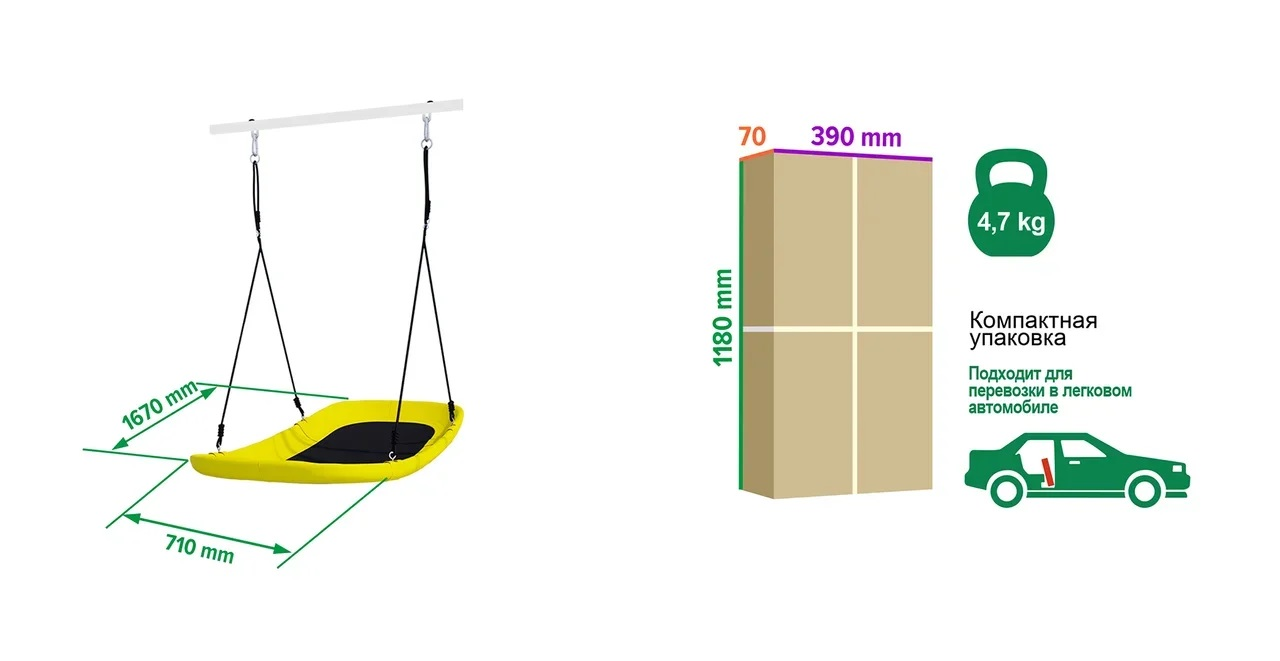 Качели предназначены для детей разных возрастных групп (от трех лет), допустимая нагрузка на изделие 100кг.