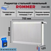 Стальной радиатор Rommer Ventil 22/200/700 с нижним подключением диаметром 1/2″. Теплоотдача радиатора 752 Вт, что достаточно для обогрева бытового помещения площадью до 8 м2. Толщина радиатора 102 мм.