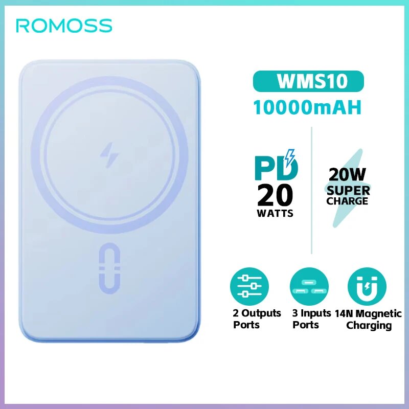 ROMOSS Power Bank 10000 мАч 15Вт беспроводная зарядка Magsafe повербанк 20Вт внешний аккумулятор For xiaomi 14 xiaomi 13 iphone 15 смартфон, WMS10 Blue, 10000 мА-ч: сравнение цен, характеристики, фото, актуальное наличие и цены.