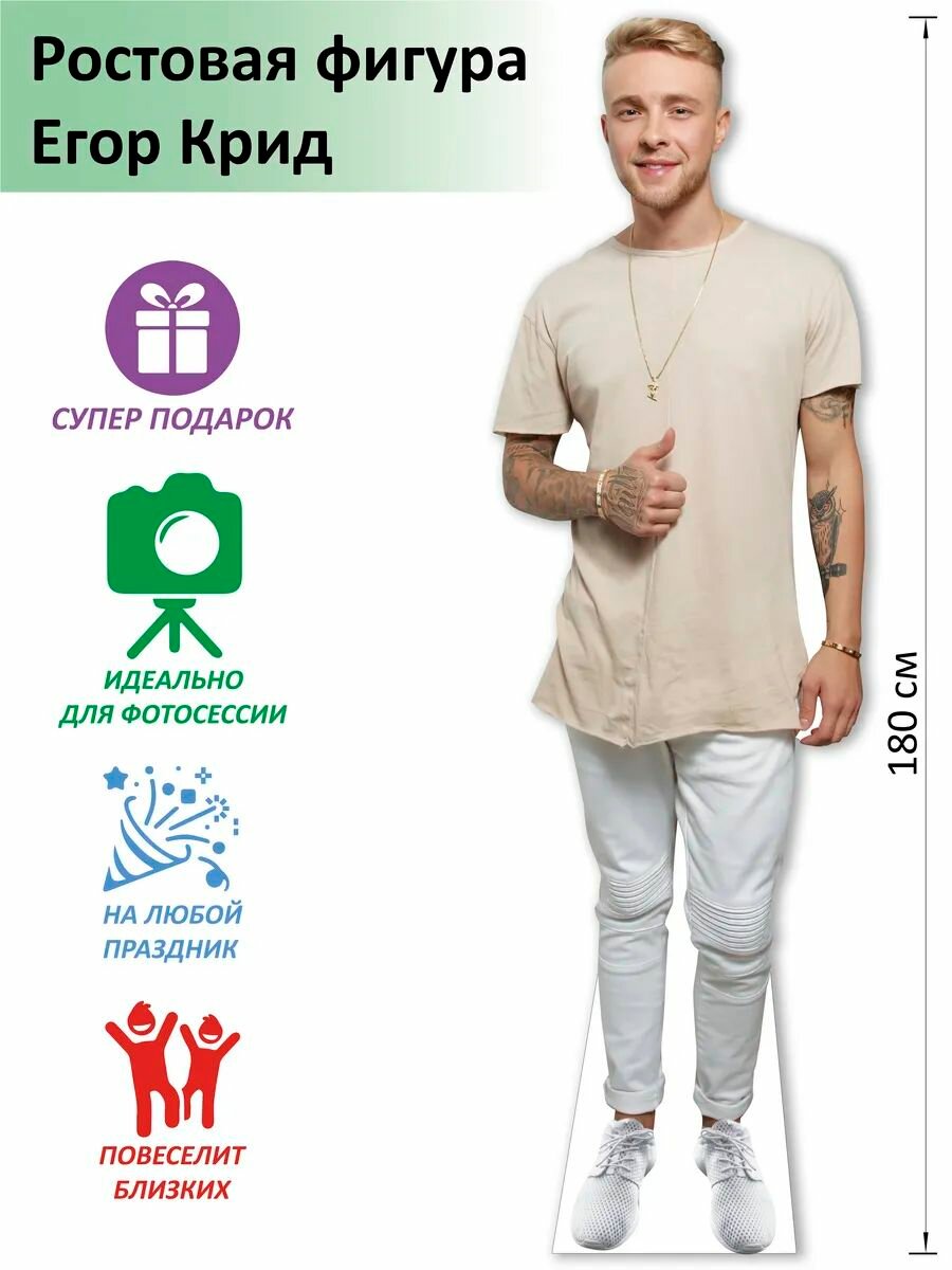 Ростовая фигура Егора Крида - это уникальный и оригинальный подарок, который станет отличным дополнением к любому празднику. Фигура выполнена в полный рост и имеет высоту 180 см, а ширина составляет 60 см.