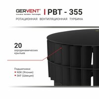 Ротационная вентиляционная турбина (турбодефлектор) РВТ – 355 изготовлена из УФ - устойчивого к любым погодным условиям композитного материала (стеклонаполненного полиамида). В качестве сборочного узла для вращения в конструкции используются подшипники NSK (Япония) и SKF (Швеция). На верхней точке турбины имеется уровень, для легкой и качественной установки дефлектора.