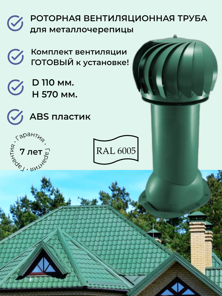 Роторный вентиляционный выход для металлочерепицы монтеррей D 110 мм. H 550 мм, утепленный, Viotto RAL 6005 зеленый: сравнение цен, характеристики, фото, актуальное наличие и цены.