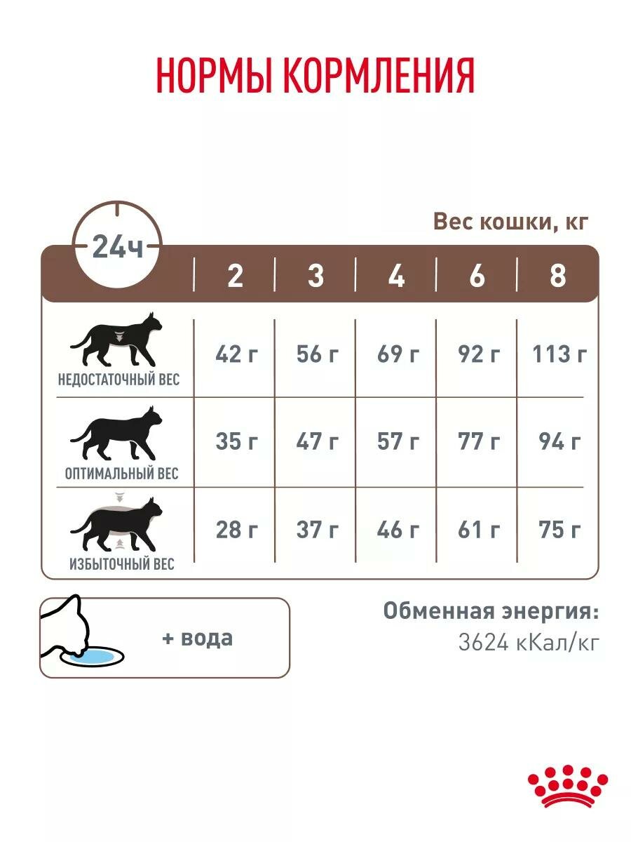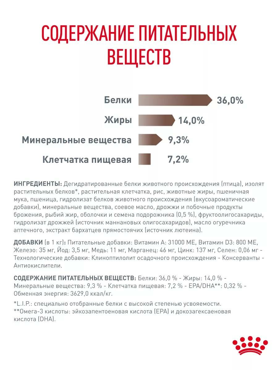 Сухой корм Royal Canin Gastrointestinal Hairball (Гастроинтестинал Хэйрболл) - полнорационный диетический корм для взрослых кошек для выведения и профилактики образования волосяных комочков. Способствует выведению проглоченной шерсти и профилактике образования волосяных комочков, помогает поддерживать здоровое пищеварение и оптимальное качество стула. Умеренное содержание энергии в диете помогает контролировать массу тела. Сухой корм Роял Канин Гастроинтестинал Хэйрболл для кошек предназначен для поддержания здоровья и пищеварительной системы. Формула, содержащая комплекс разных видов клетчатки, в том числе пребиотики, способствует поддержанию здорового пищеварения и оптимального качества стула. Контроль образования волосяных комочков. Особое сочетание разных видов клетчатки в корме Royal Canin Gastrointestinal Hairball (Гастроинтестинал Хэйрболл) способствует выведению проглоченной шерсти и профилактике образования волосяных комочков. Умеренное содержание энергии в диете Роял Канин для кошек помогает контролировать массу тела. Эта диета способствует созданию в мочевыделительной системе среды, неблагоприятной для формирования как струвитных, так и оксалатных кристаллов. Состав: дегидратированные белки животного происхождения; рис; мука из зерновых культур; пшеница; животные жиры; изолят растительных белков; гидролизат белков животного происхождения (вкусоароматические добавки); растительная клетчатка; минеральные вещества; соевое масло; дрожжи и побочные продукты брожения; рыбий жир; аминокислоты; фруктоолигосахариды. Добавки (в 1 кг): Питательные добавки: Витамин A: 31000 ME, Витамин D3: 800 ME, Железо: 35 мг, Йод: 3,5 мг, Медь: 11 мг, Марганец: 46 мг, Цинк: 137 мг, Ceлeн: 0,06 мг - Технологические добавки: Клиноптилолит осадочного происхождения - Консерванты - Антиокислители. Содержание питательных веществ: Белки: 36,0 % - Жиры: 14,0 % - Минеральные вещества: 9,3 % - Клетчатка пищевая: 7,2 % - EPA/DHA: 0,32 % - Обменная энергия: 3629,0 ккал/кг.