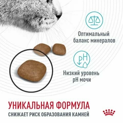 - доказанная эффективность: заметный результат через 10 дней кормления только продуктом URINARY CARE. Риск мочекаменной болезни в ДВА раза ниже*. * В сравнении с применением обычных кормов для кошек (данные внутреннего исследования Royal Canin, 2014 г.).