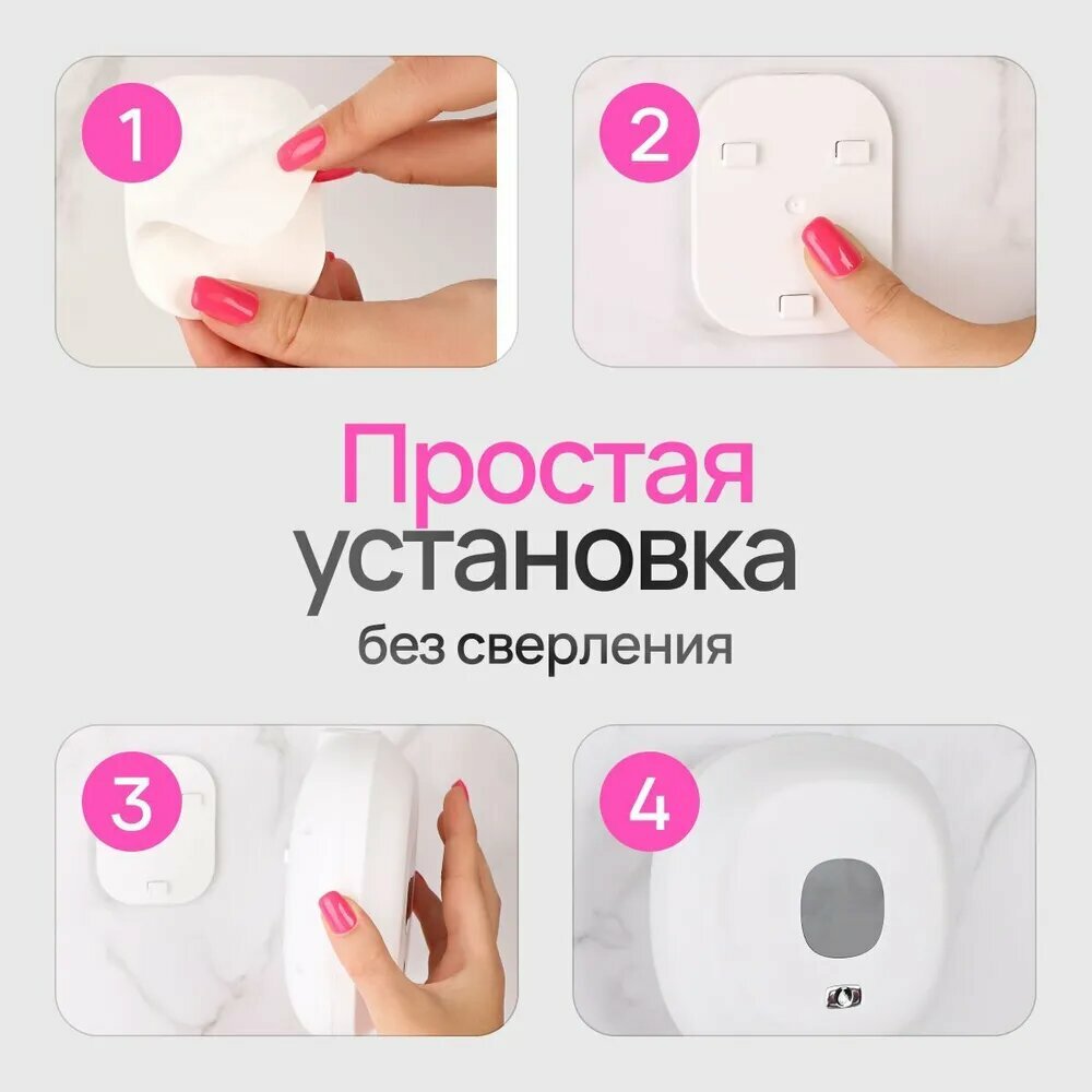 Диспенсер имеет компактный размер и легко крепится на стену с помощью прочной липкой основы. Это позволяет разместить его в любом удобном месте, не занимая рабочую поверхность.