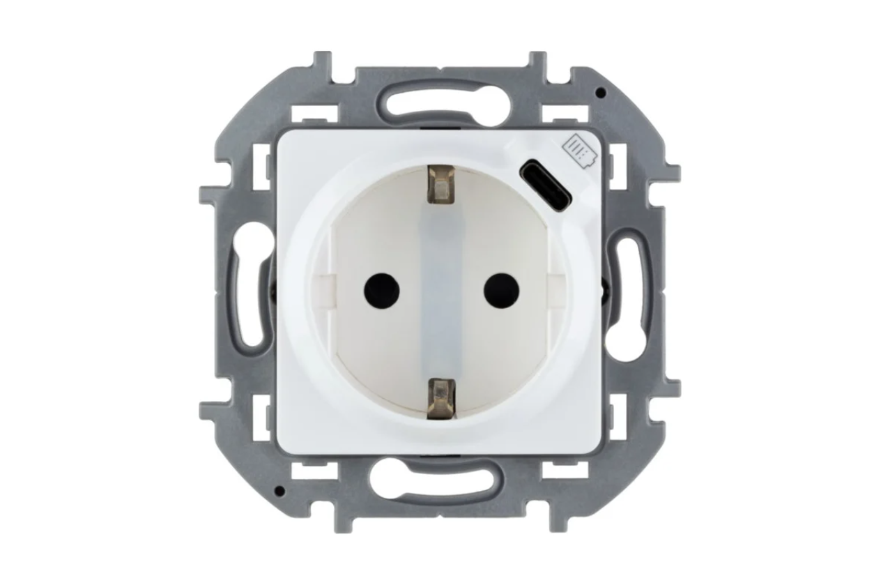 Комбинированная розетка 2К+З с зарядным устройством USB тип С Legrand Inspiria для скрытого монтажа, цвет "Белый". Максимальный ток розетки 16АХ, напряжение розетки ~250В, напряжение зарядного устройства =5В, максимальный зарядный ток 1500 мА.