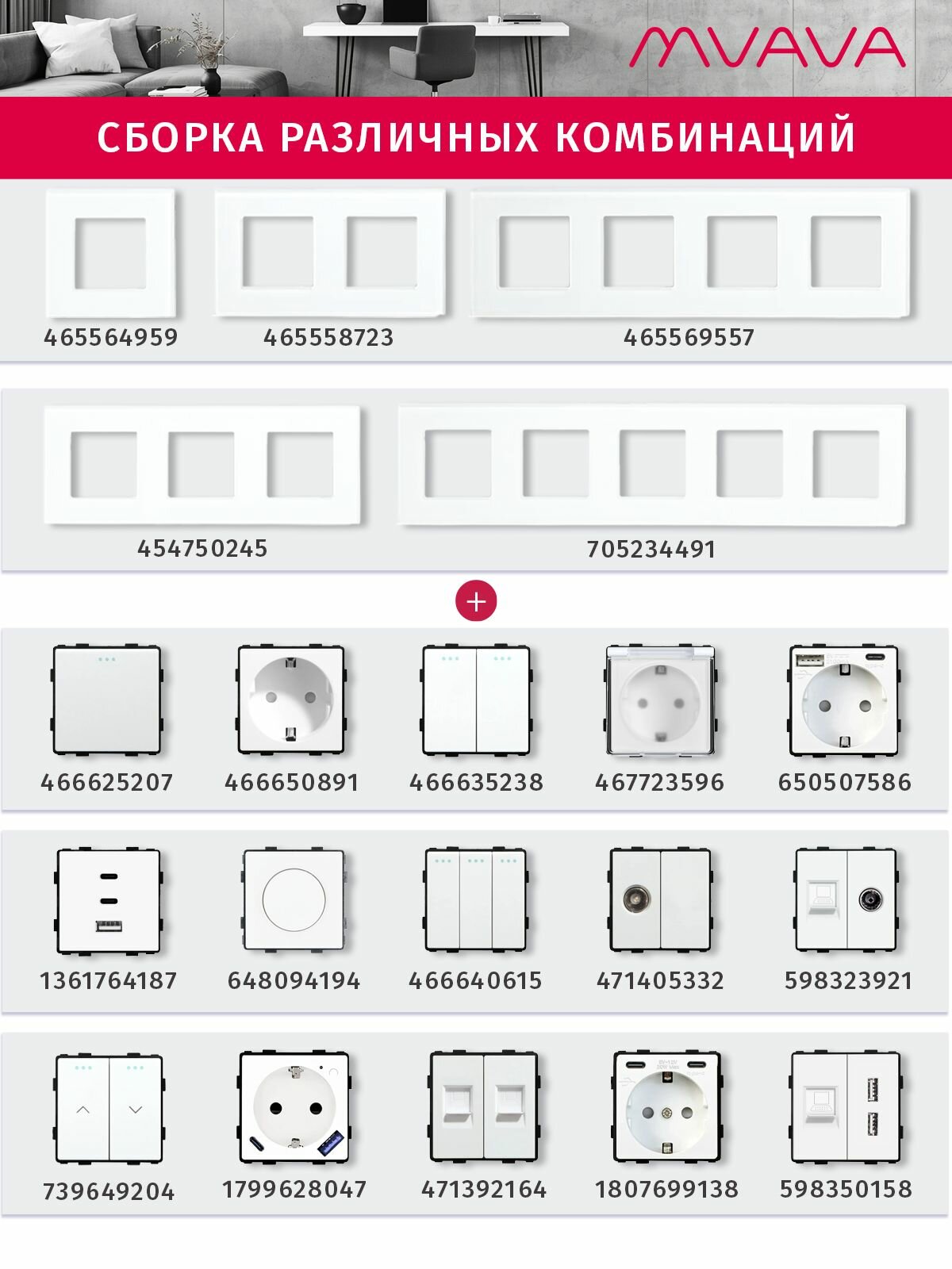 Комбинации с другими электроустановочными изделиями (выключатели, розетки ТВ, Интернет)