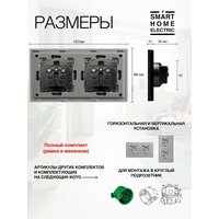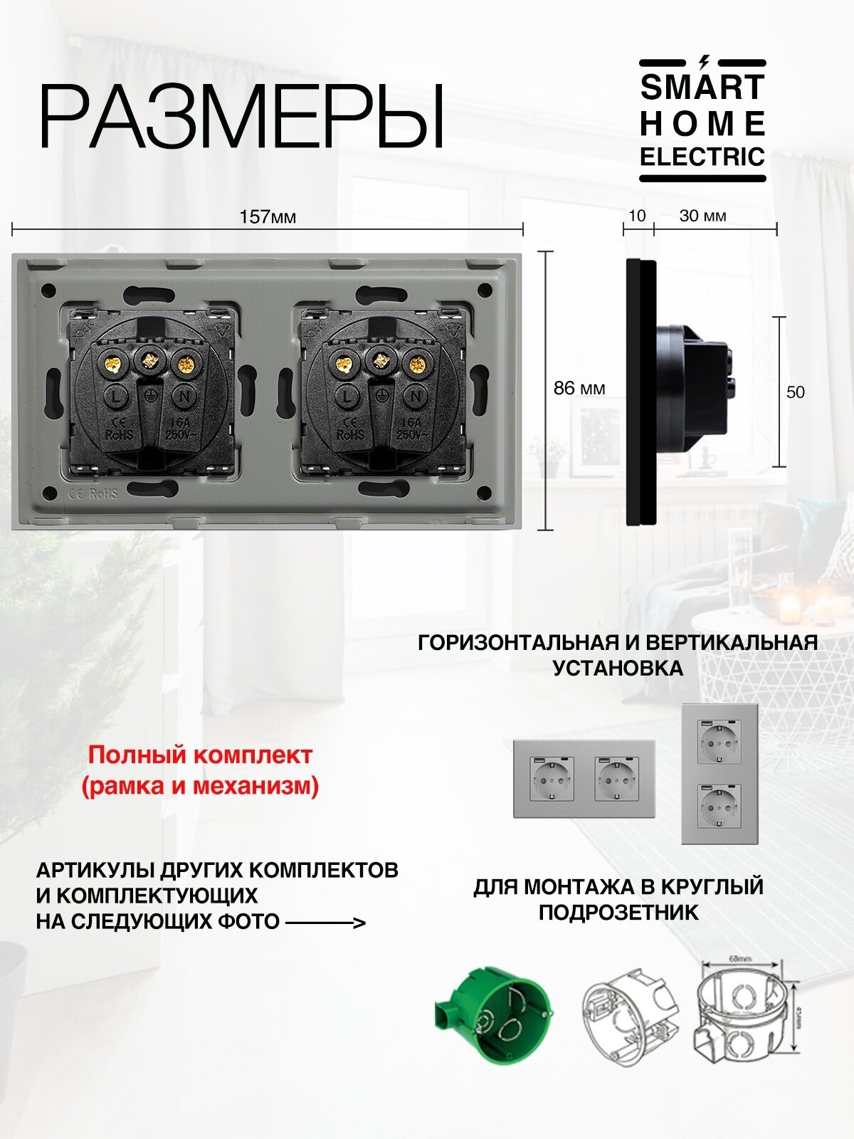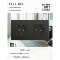 Двойная электрическая розетка черного цвета. Это готовый комплект для установки, докупать ничего не нужно. Устанавливается в двойной стандартный круглый подрозетник. – Рамка из ABS пластика 157 на 86 мм. Выпирает от стены всего на 10 мм. Выглядит качественно, аккуратно, простая и хорошая рамка. – Блок электрической розетки с заземлением. Универсальная розетка на 16А. Оснащена защитными шторками от засовывания посторонних предметов детьми. . Другие розетки и выключатели также есть в наличии в нашем магазине.