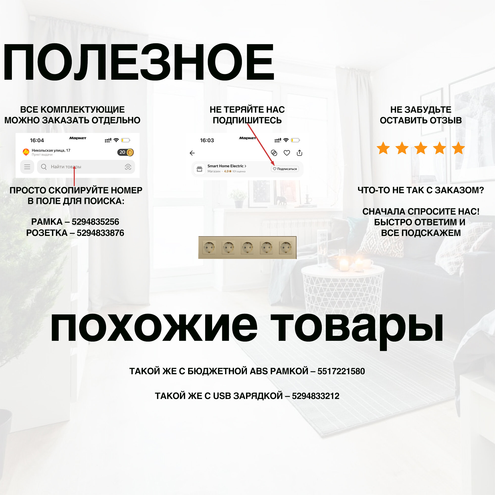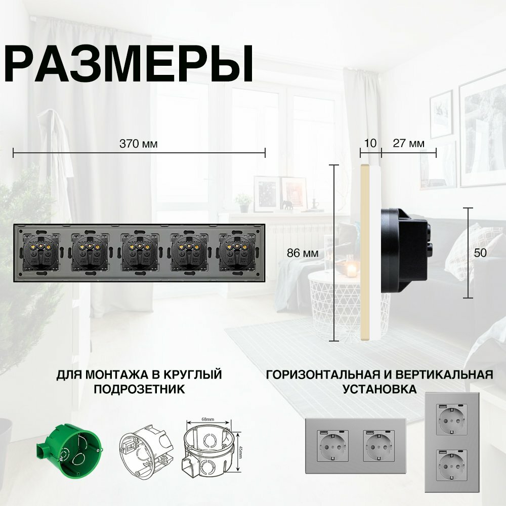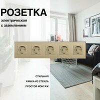 Пятерная электрическая розетка со стеклянной рамкой золотого цвета. Это готовый комплект для установки, докупать ничего не нужно. Устанавливается в пятерной стандартный круглый подрозетник. – Рамка из натурального стекла 370 на 86 мм. Выпирает от стены всего на 10 мм. Выглядит стильно, легко вписывается в любой интерьер. – Блок электрической розетки с заземлением. Универсальная розетка на 16А. Оснащена защитными шторками от засовывания посторонних предметов детьми. . Другие розетки и выключатели также есть в наличии в нашем магазине.