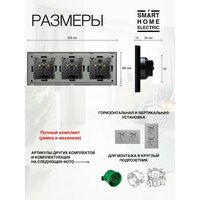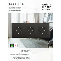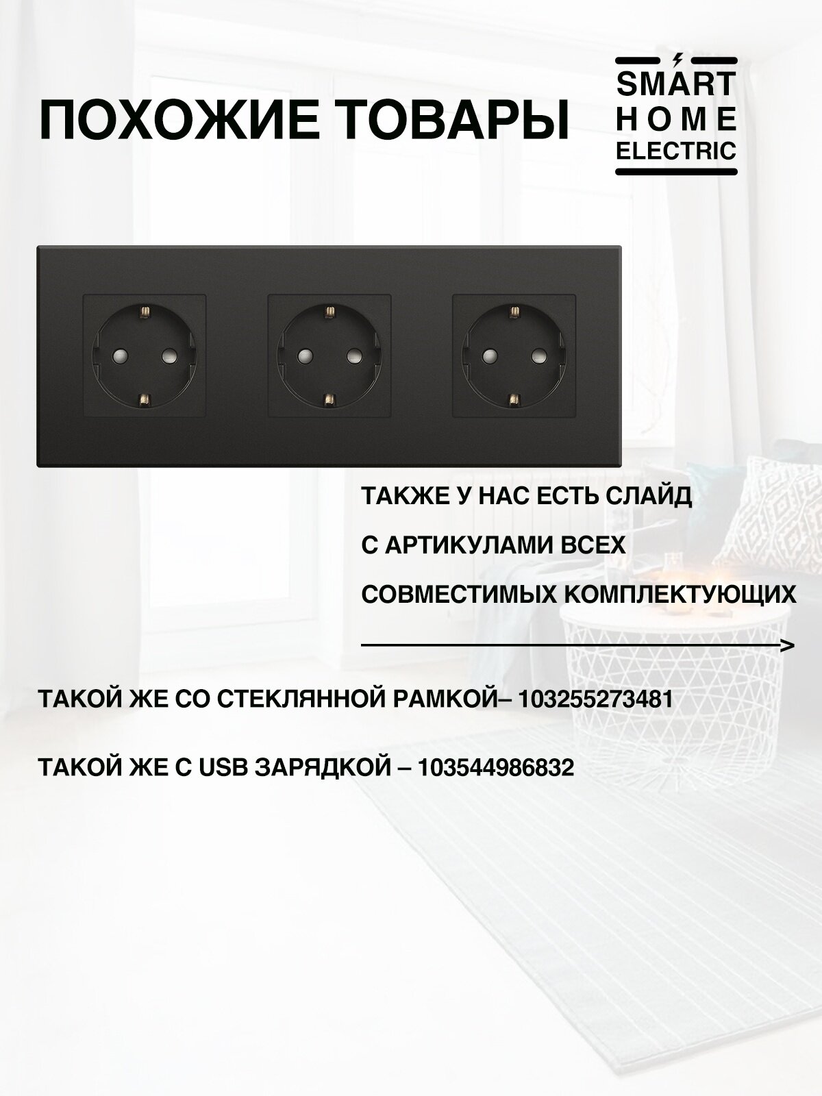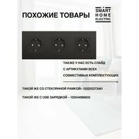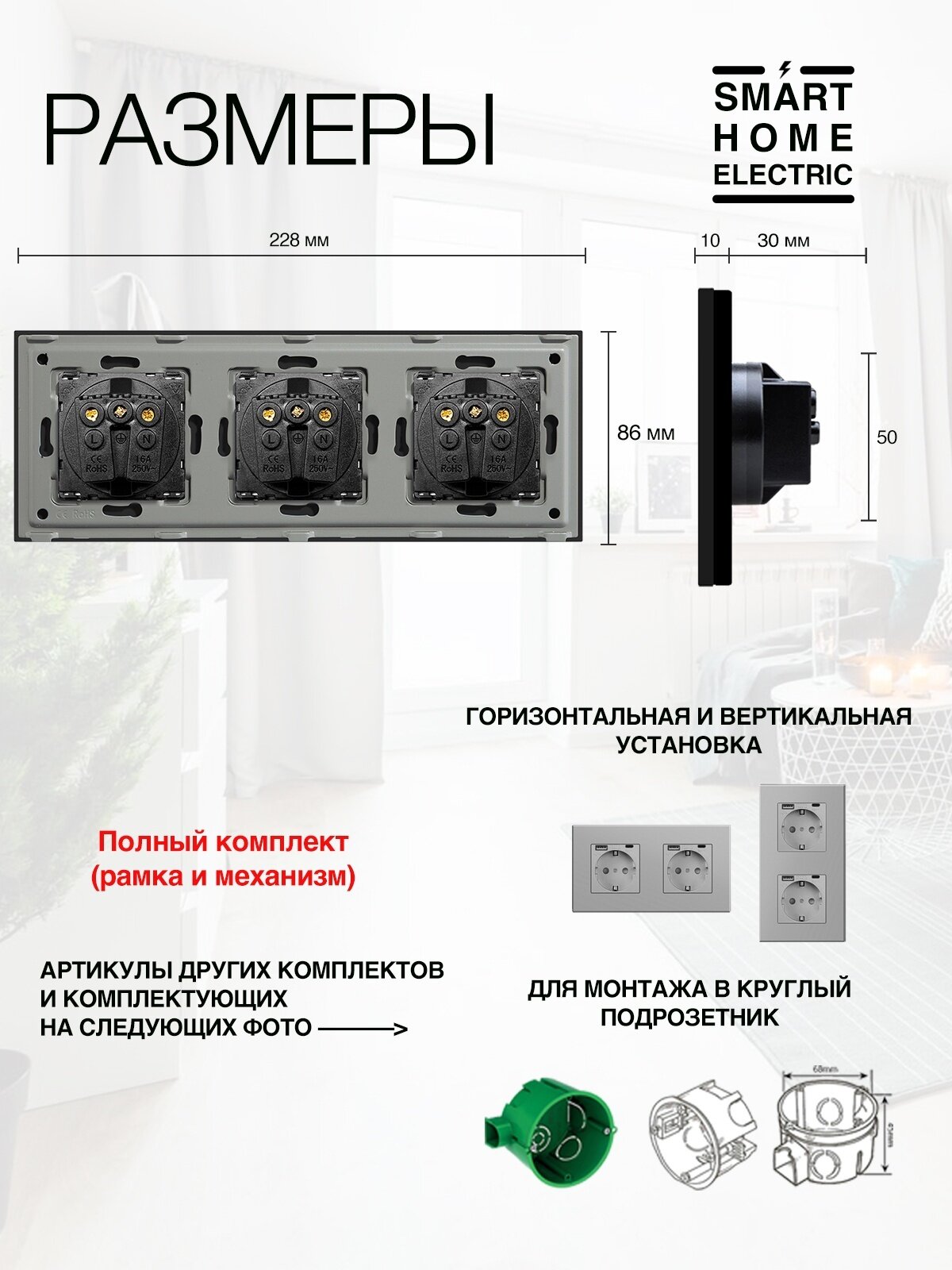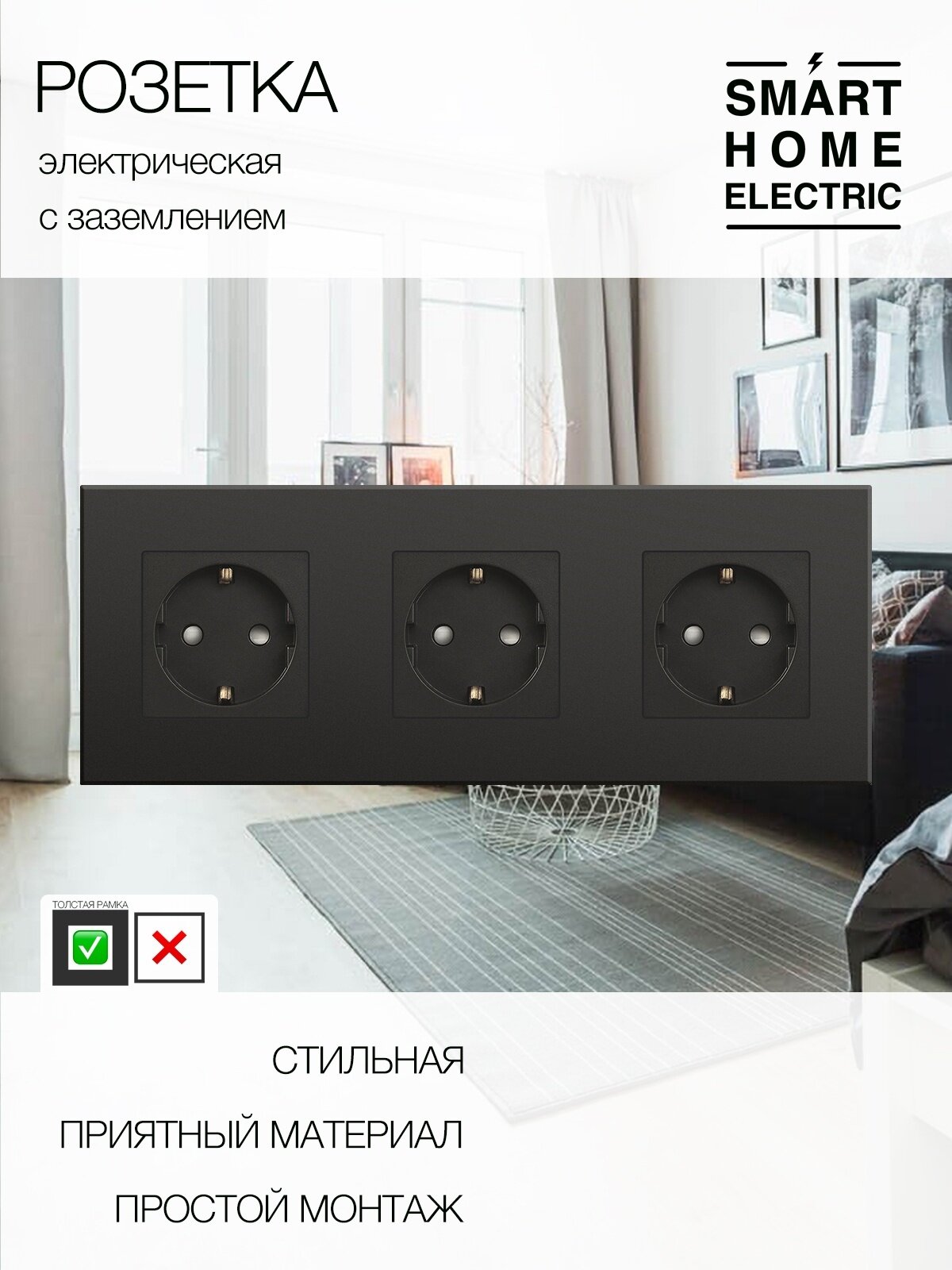 Тройная электрическая розетка черного цвета. Это готовый комплект для установки, докупать ничего не нужно. Устанавливается в тройной стандартный круглый подрозетник. – Рамка из ABS пластика 228 на 86 мм. Выпирает от стены всего на 10 мм. Выглядит качественно, аккуратно, простая и хорошая рамка. – Блок электрической розетки с заземлением. Универсальная розетка на 16А. Оснащена защитными шторками от засовывания посторонних предметов детьми. . Другие розетки и выключатели также есть в наличии в нашем магазине.
