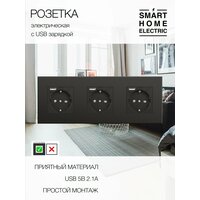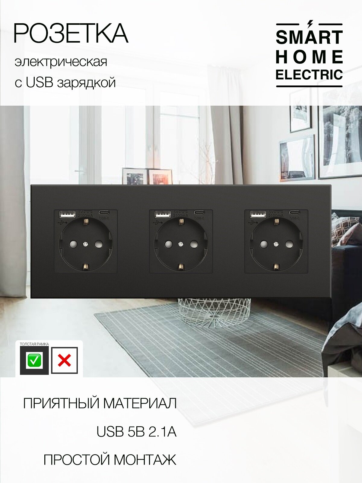 Тройная электрическая розетка со встроенной зарядкой USB черного цвета. Это готовый комплект для установки, докупать ничего не нужно. Устанавливается в тройной стандартный круглый подрозетник. – Рамка из ABS пластика 228 на 86 мм. Выпирает от стены всего на 10 мм. Выглядит качественно, аккуратно, простая и хорошая рамка. – Блок электрической розетки с USB зарядкой. Универсальная розетка на 16А с дополнительными разъемами USB для зарядки телефонов. Два разъема для зарядки гаджетов: Популярный USB-A и современный USB-C, подойдет любой провод. Мощность зарядки 2.1А или 10Вт. Зарядит Iphone 15 с 0 до 100 % примерно за 2 часа. Если заряжать 2 устройства одновременно - скорость зарядки будет меньше в 2 раза. . Другие розетки и выключатели также есть в наличии в нашем магазине.