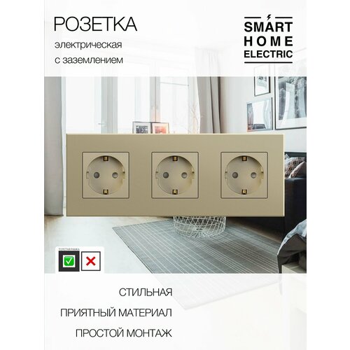 Тройная электрическая розетка золотого цвета. Это готовый комплект для установки, докупать ничего не нужно. Устанавливается в тройной стандартный круглый подрозетник. – Рамка из ABS пластика 228 на 86 мм. Выпирает от стены всего на 10 мм. Выглядит качественно, аккуратно, простая и хорошая рамка. – Блок электрической розетки с заземлением. Универсальная розетка на 16А. Оснащена защитными шторками от засовывания посторонних предметов детьми. . Другие розетки и выключатели также есть в наличии в нашем магазине.