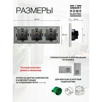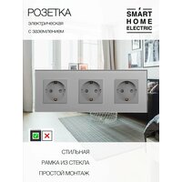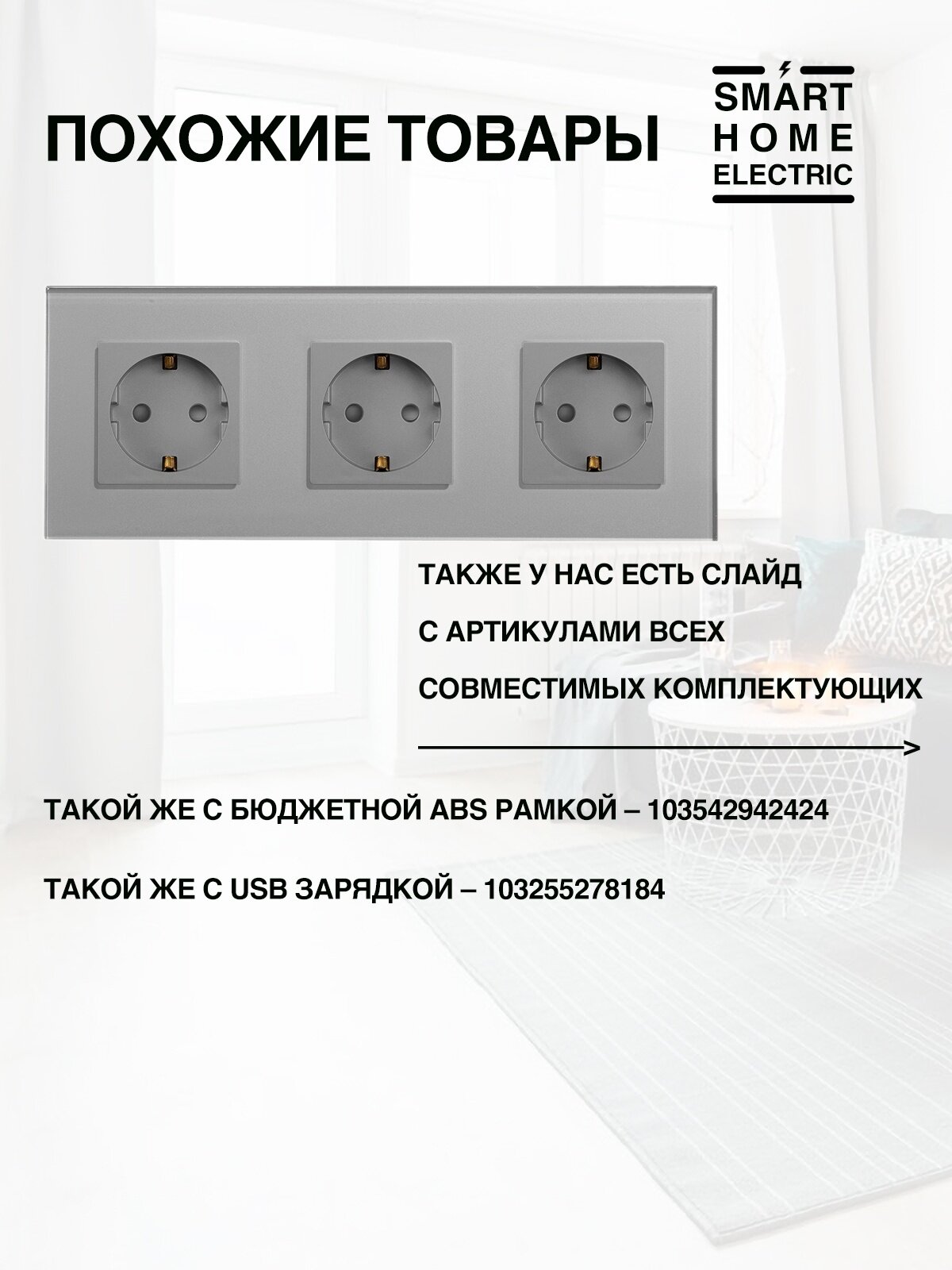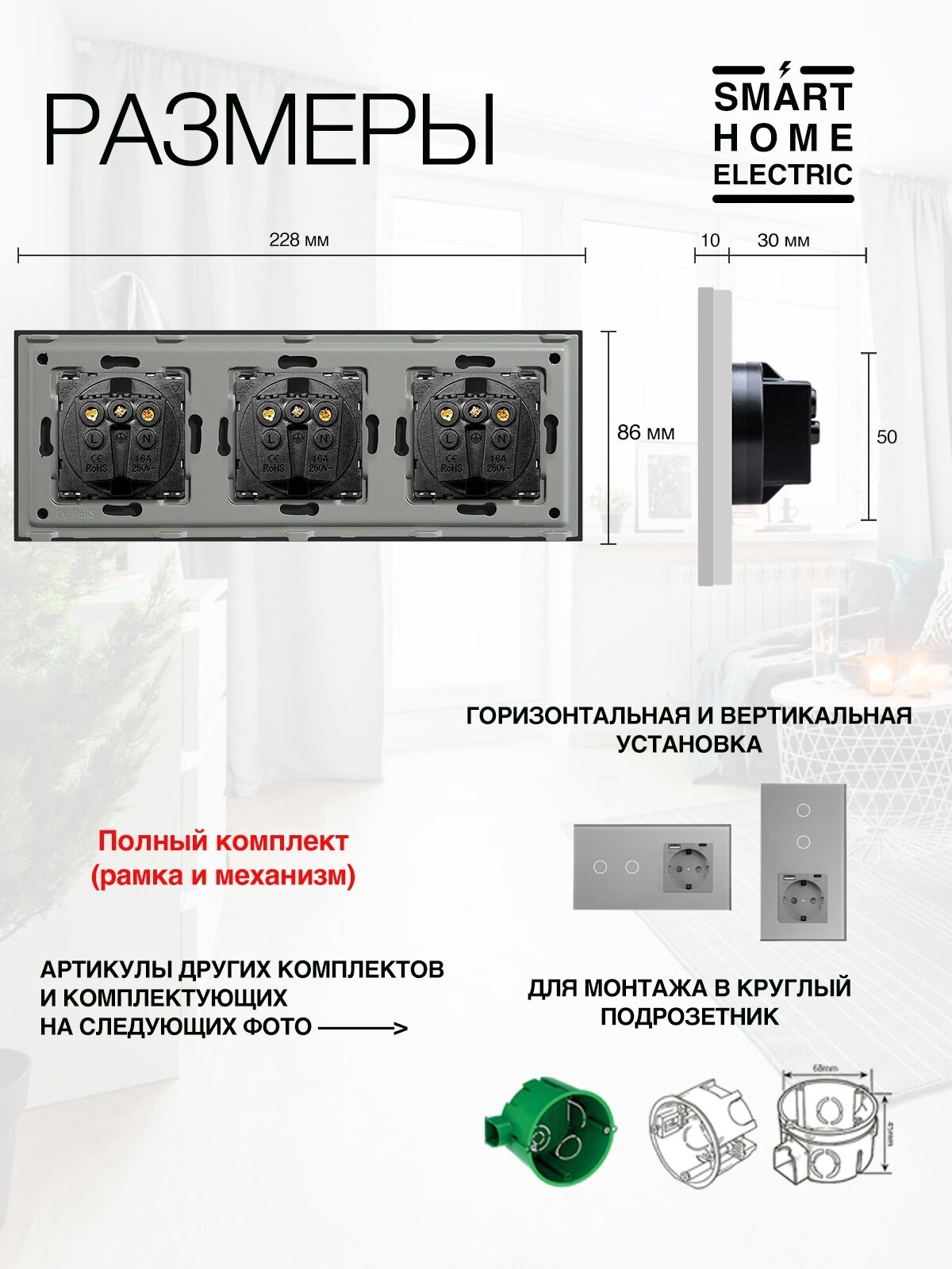 Тройная электрическая розетка со стеклянной рамкой серого цвета. Это готовый комплект для установки, докупать ничего не нужно. Устанавливается в тройной стандартный круглый подрозетник. – Рамка из натурального стекла 228 на 86 мм. Выпирает от стены всего на 10 мм. Выглядит стильно, легко вписывается в любой интерьер. – Блок электрической розетки с заземлением. Универсальная розетка на 16А. Оснащена защитными шторками от засовывания посторонних предметов детьми. . Другие розетки и выключатели также есть в наличии в нашем магазине.