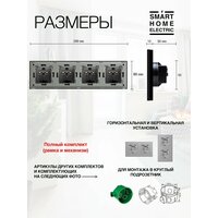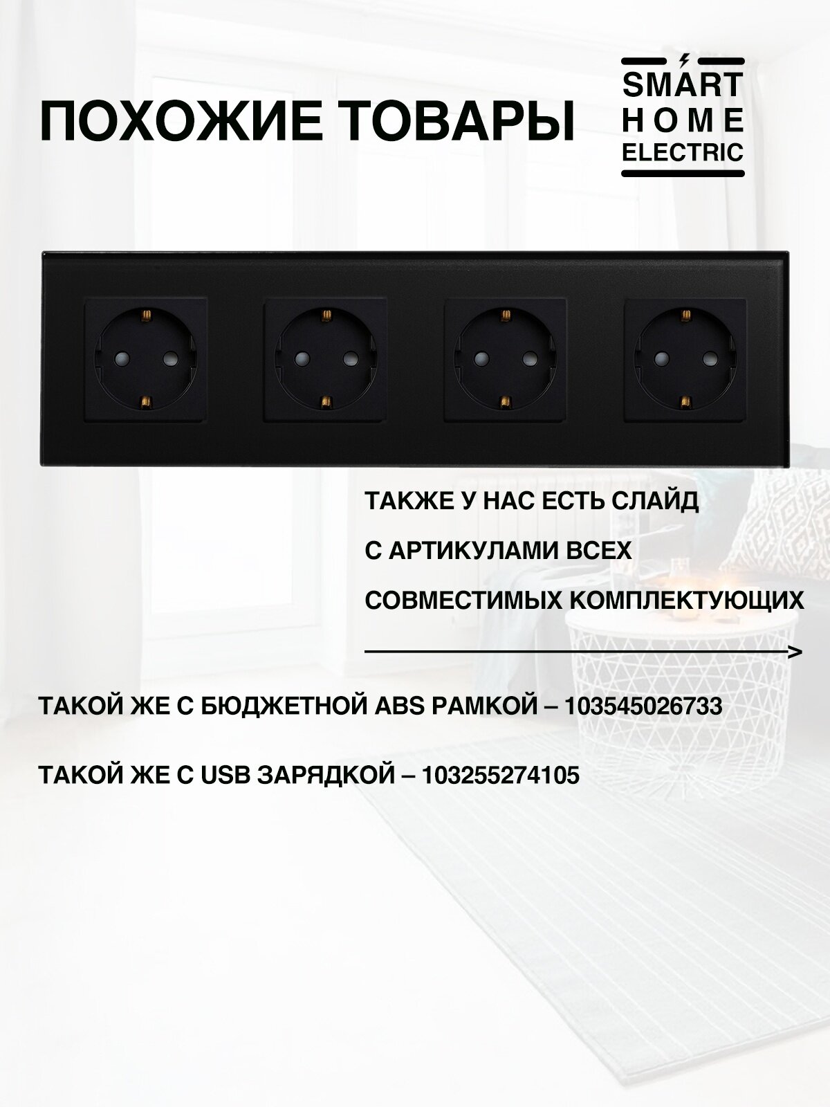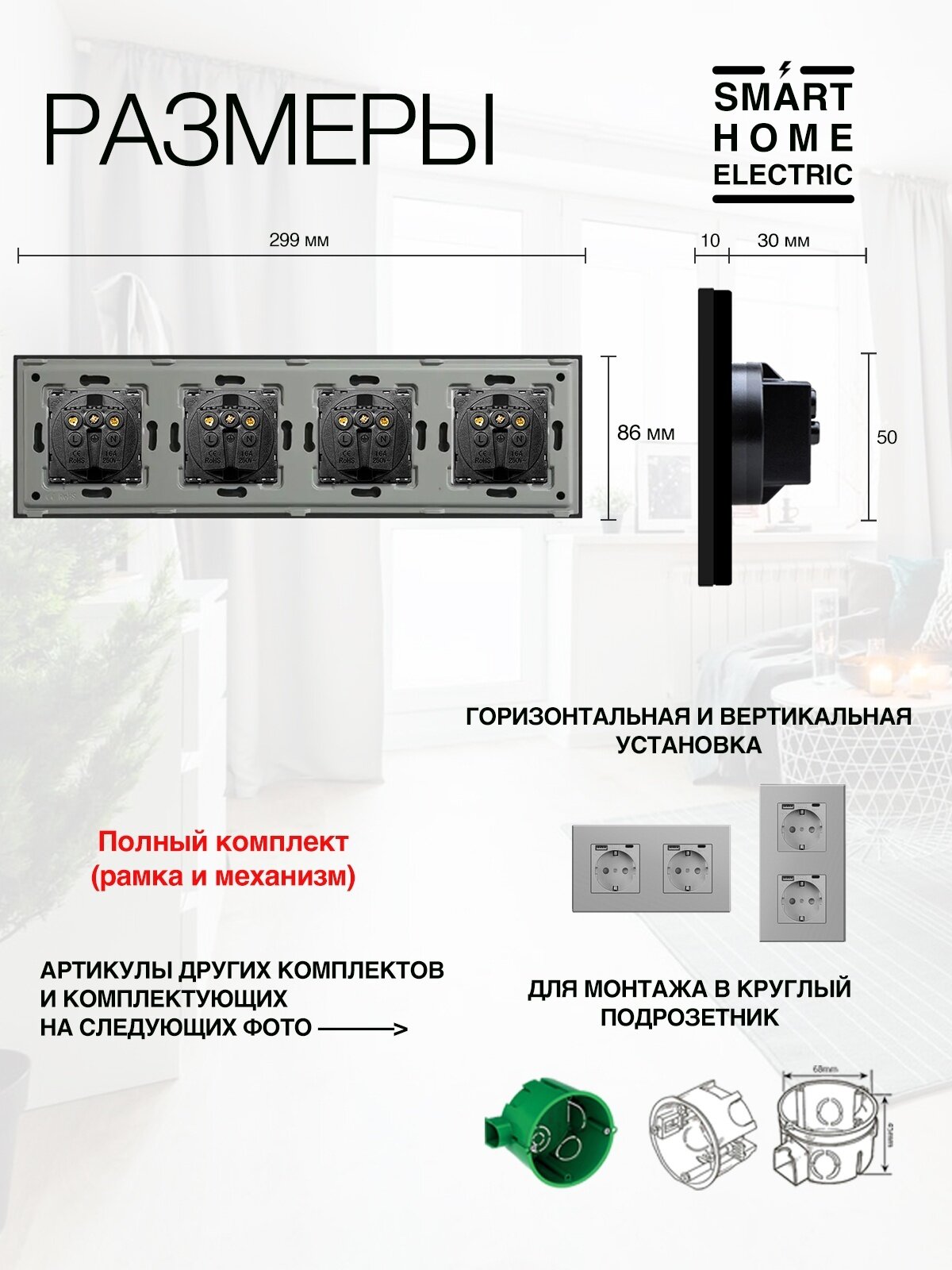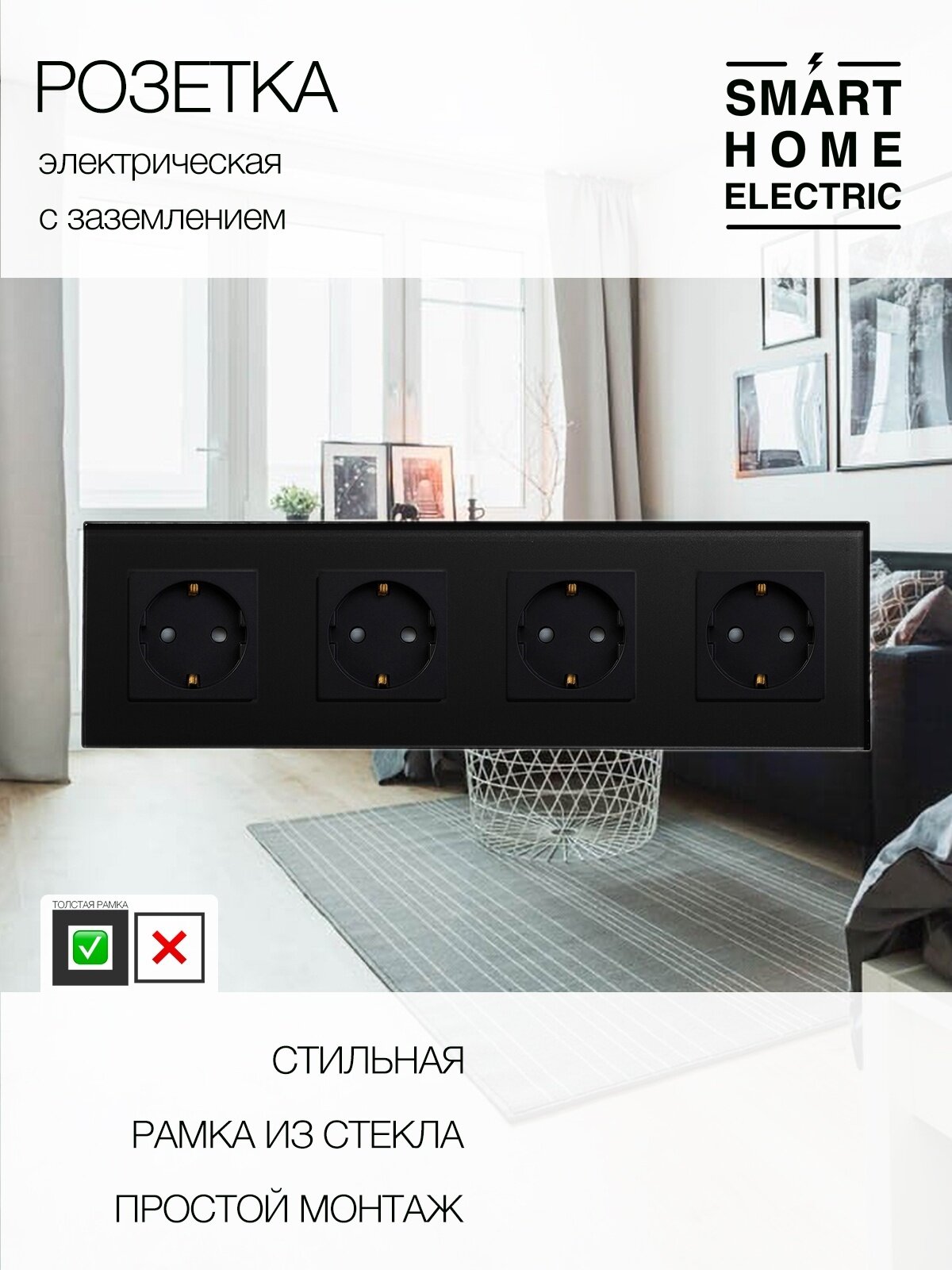 Четверная электрическая розетка со стеклянной рамкой черного цвета. Это готовый комплект для установки, докупать ничего не нужно. Устанавливается в четверной стандартный круглый подрозетник. – Рамка из натурального стекла 299 на 86 мм. Выпирает от стены всего на 10 мм. Выглядит стильно, легко вписывается в любой интерьер. – Блок электрической розетки с заземлением. Универсальная розетка на 16А. Оснащена защитными шторками от засовывания посторонних предметов детьми. . Другие розетки и выключатели также есть в наличии в нашем магазине.