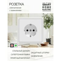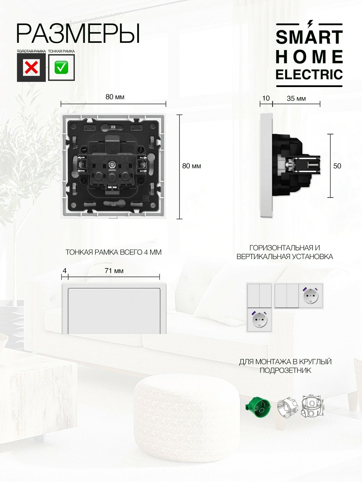 Розетка электрическая белого цвета. Это готовый комплект для установки, докупать ничего не нужно. Устанавливается в стандартный круглый подрозетник. – Стильная тонкая рамка шириной 4мм отлично впишется в любой интерьер. Размеры 80 на 80 мм. Выпирает от стены всего на 10 мм. Матовое soft-touch покрытие, которого хочется касаться. – Блок электрической розетки с заземлением. Универсальная розетка на 16А. Оснащена защитными шторками от засовывания посторонних предметов детьми. Другие розетки и выключатели также есть в наличии в нашем магазине.