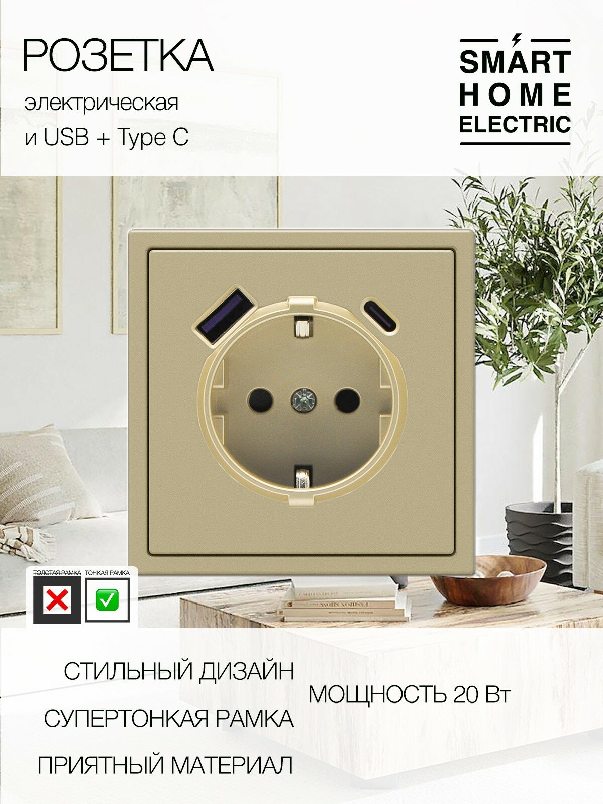 Розетка электрическая со встроенной зарядкой USB золотого цвета. Это готовый комплект для установки, докупать ничего не нужно. Устанавливается в стандартный круглый подрозетник. – Стильная тонкая рамка шириной 4мм отлично впишется в любой интерьер. Размеры 80 на 80 мм. Выпирает от стены всего на 10 мм. Матовое soft-touch покрытие, которого хочется касаться. – Блок электрической розетки с USB зарядкой. Универсальная розетка на 16А с дополнительными разъемами USB для зарядки телефонов. Два разъема для зарядки гаджетов: Популярный USB-A и современный USB-C, подойдет любой провод. Мощность зарядки 20Вт. Зарядит Iphone 15 с 0 до 100 % примерно за 1 час. Поддерживает протоколы быстрой зарядки. Другие розетки и выключатели также есть в наличии в нашем магазине.