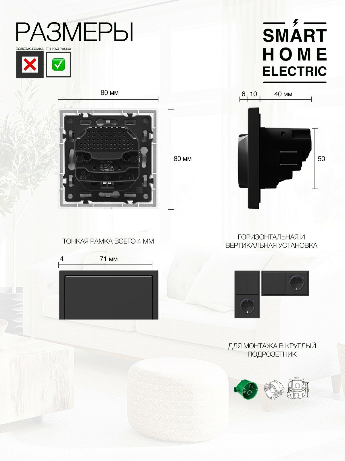 Розетка электрическая со встроенной зарядкой USB черного цвета. Это готовый комплект для установки, докупать ничего не нужно. Устанавливается в стандартный круглый подрозетник. – Стильная тонкая рамка шириной 4мм отлично впишется в любой интерьер. Размеры 80 на 80 мм. Выпирает от стены всего на 10 мм. Матовое soft-touch покрытие, которого хочется касаться. – Блок электрической розетки с USB зарядкой. Универсальная розетка на 16А с дополнительными разъемами USB для зарядки телефонов. Два разъема для зарядки гаджетов: Популярный USB-A и современный USB-C, подойдет любой провод. Мощность зарядки 20Вт. Зарядит Iphone 15 с 0 до 100 % примерно за 1 час. Поддерживает протоколы быстрой зарядки. Другие розетки и выключатели также есть в наличии в нашем магазине.