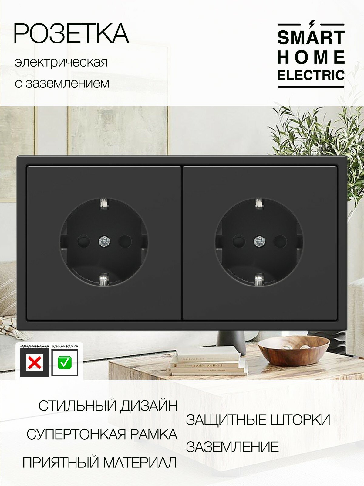 Двойная электрическая розетка черного цвета. Это готовый комплект для установки, докупать ничего не нужно. Устанавливается в двойной стандартный круглый подрозетник. – Стильная тонкая рамка шириной 4мм отлично впишется в любой интерьер. Размеры 150 на 80 мм. Выпирает от стены всего на 10 мм. Матовое soft-touch покрытие, которого хочется касаться. – Блок электрической розетки с заземлением. Универсальная розетка на 16А. Оснащена защитными шторками от засовывания посторонних предметов детьми. Другие розетки и выключатели также есть в наличии в нашем магазине.