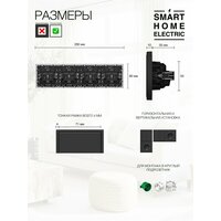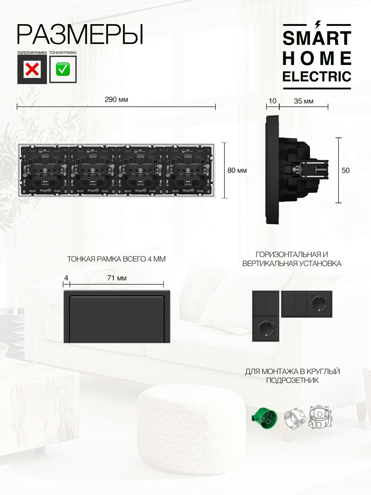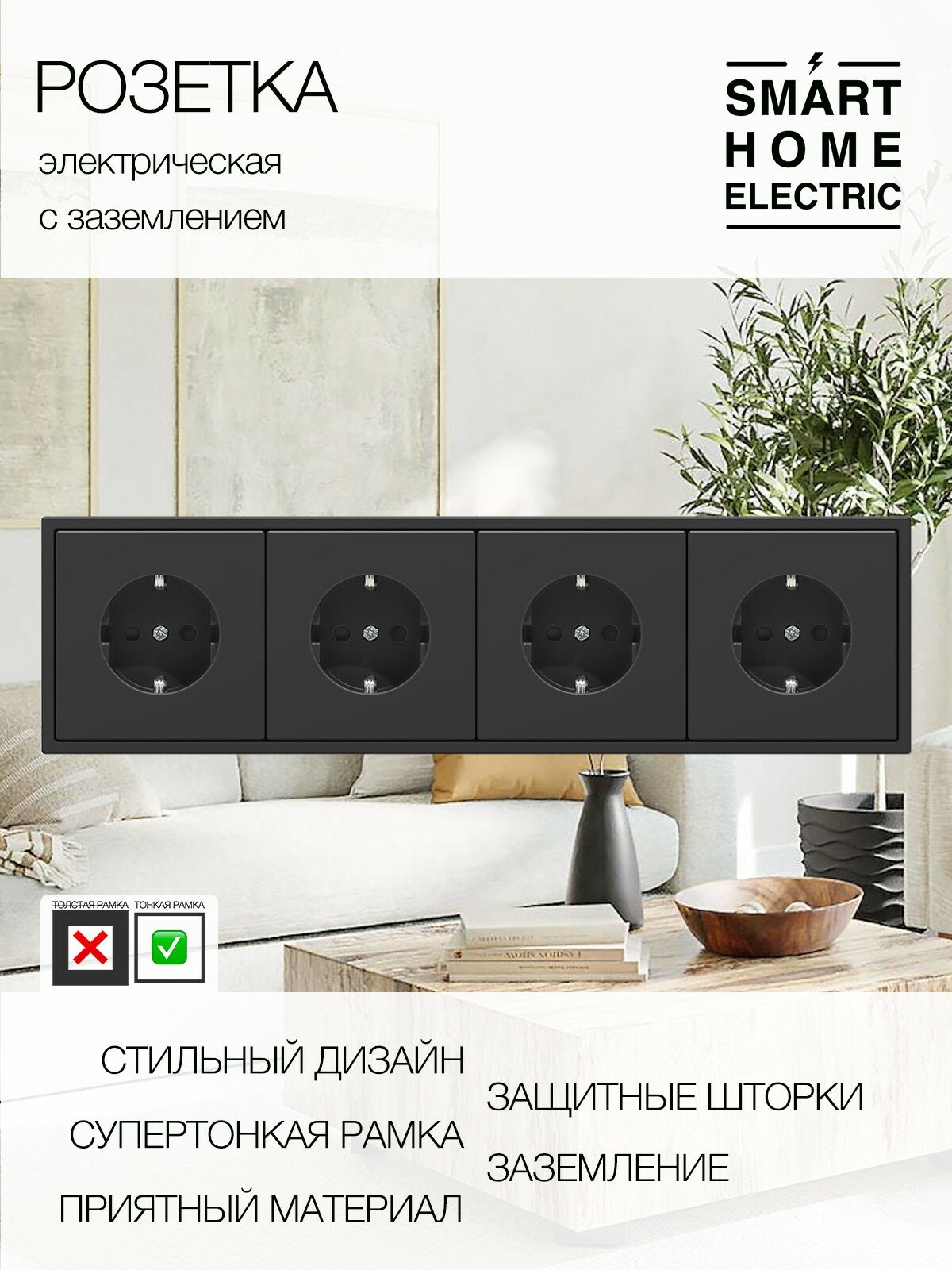 Четверная электрическая розетка черного цвета. Это готовый комплект для установки, докупать ничего не нужно. Устанавливается в четверной стандартный круглый подрозетник. – Стильная тонкая рамка шириной 4мм отлично впишется в любой интерьер. Размеры 290 на 80 мм. Выпирает от стены всего на 10 мм. Матовое soft-touch покрытие, которого хочется касаться. – Блок электрической розетки с заземлением. Универсальная розетка на 16А. Оснащена защитными шторками от засовывания посторонних предметов детьми. Другие розетки и выключатели также есть в наличии в нашем магазине.