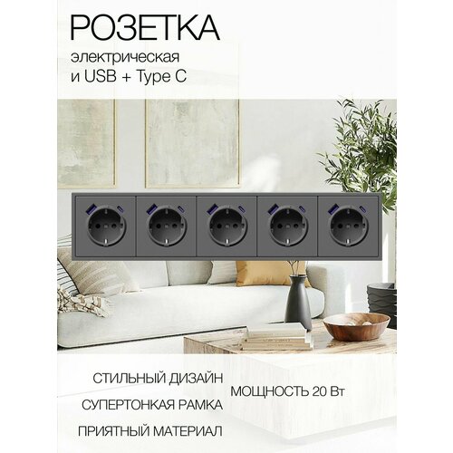 Пятерная электрическая розетка со встроенной зарядкой USB серого цвета. Это готовый комплект для установки, докупать ничего не нужно. Устанавливается в пятерной стандартный круглый подрозетник. – Стильная тонкая рамка шириной 4мм отлично впишется в любой интерьер. Размеры 360 на 80 мм. Выпирает от стены всего на 10 мм. Матовое soft-touch покрытие, которого хочется касаться. – Блок электрической розетки с USB зарядкой. Универсальная розетка на 16А с дополнительными разъемами USB для зарядки телефонов. Два разъема для зарядки гаджетов: Популярный USB-A и современный USB-C, подойдет любой провод. Мощность зарядки 20Вт. Зарядит Iphone 15 с 0 до 100 % примерно за 1 час. Поддерживает протоколы быстрой зарядки. Другие розетки и выключатели также есть в наличии в нашем магазине.