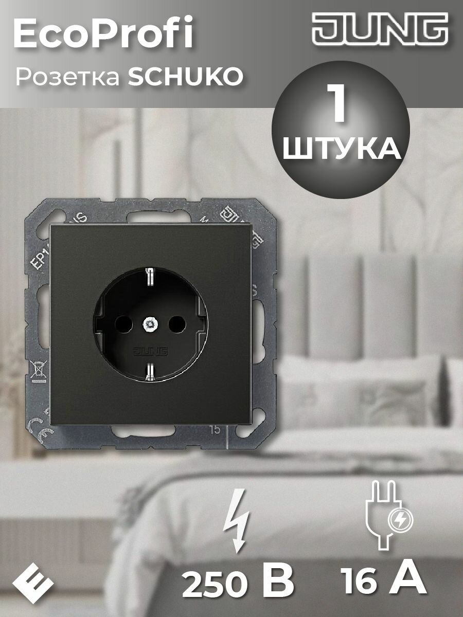 Розетка с заземлением, автозажим цвет Черный матовый JUNG EcoProfi: сравнение цен, характеристики, фото, актуальное наличие и цены.