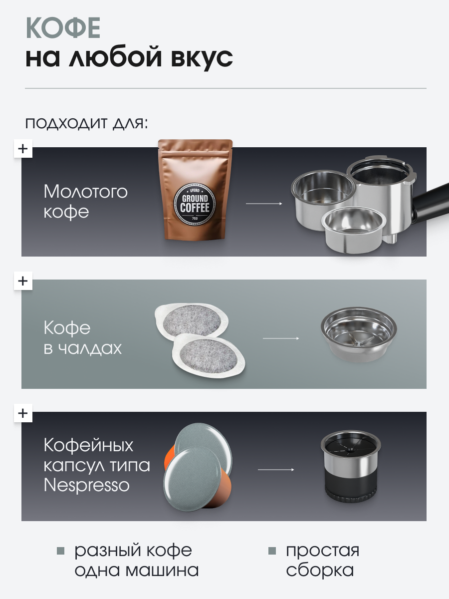 | Дополнительная информация | Кофеварка - 1шт.; Резервуар для воды 1000 мл - 1 шт.; Резервуар для молока 700 мл - 1 шт.; Поддон для сбора капель - 1шт.; Держатель для фильтра (Портафильтр) - 1шт.; Фильтр для кофе одной порции - 1шт.; Фильтр для кофе двойной порции - 1шт.; Фильтр-насадка для кофейных капсул Nespresso - 1 шт.; Фильтр-насадка для чалдов - 1 шт.; Мерная ложка с темпером - 1 шт.; книга бариста - 1шт.; руководство по эксплуатации - 1 шт. |