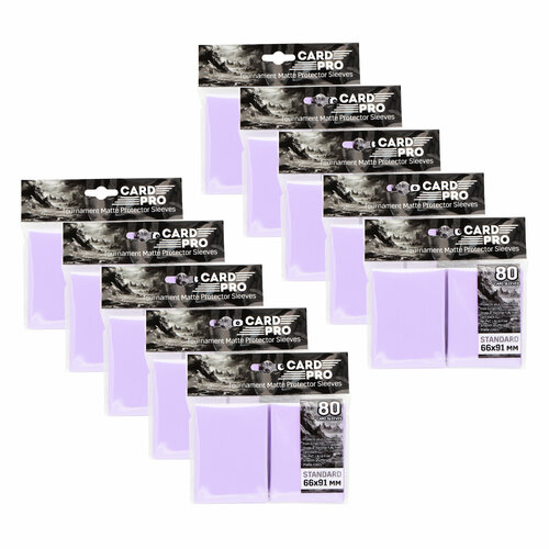 В наборе 10 упаковок по 80 матовых протекторов Card-Pro размером 66х91мм. Протекторы подходят для большинства коллекционных карточных игр. Одной пачкой протекторов вы сможете "нарядить" всю колоду, включая сайдборд, и у вас останется 5 протекторов "про запас".