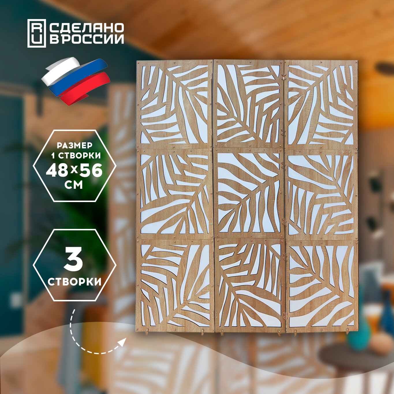 Раскладная Ширма перегородка высота 170 см ширина 145 см Хотите стильный современный и уникальный интерьер в своей квартире, доме, ресторане или офисе? Не знаете как зонировать пространство в своей гостиной, спальне, кухне, в кабинете или детской комнате, чтобы это было красиво, функционально и недорого? Компания Микс знает решение. Декоративный элемент мебели для визуального зонирования пространства – складная ширма это декоративная перегородка, сделанная из высококачественных материалов, имитирующих дерево разных пород. Ширма для зонирования пространства имеет отменные эстетические качества, благодаря чему служит настоящим украшением интерьера, подчеркивая стиль и элегантность оформления. Напольная раскладная ширма, перегородка для зонирования комнаты имеет основную матрицу, толщиной 9 мм с рисунком папоротник или пожеланю мжожно выбрать ширму в виде сот, благодаря чему ширма для зонирования пространства от компании Микс выглядит стильно, красиво и современно и подойдет в любой интерьер. . Красивые и качественные декоративные ширмы от Микс впишутся в любой интерьер дома, квартиры, дачи. Интерьерные перегородки - ширмы будут стильно смотреться в ресторане, салоне красоты, в медицинских учреждениях, в офисе, в детском саду и других пространствах.