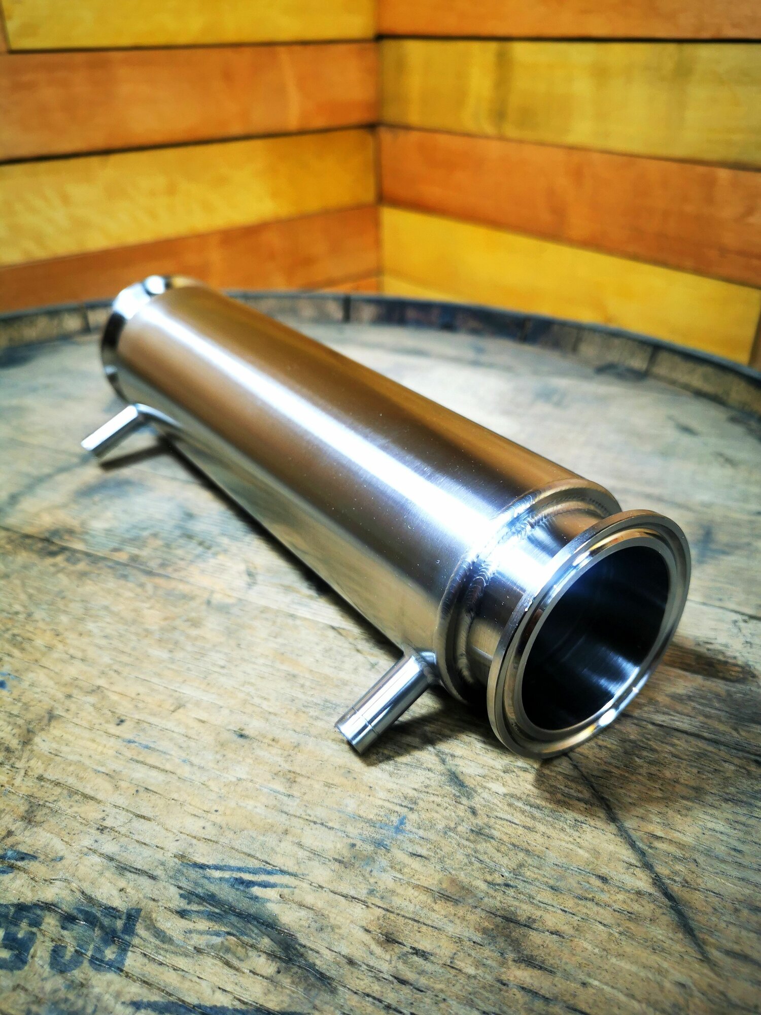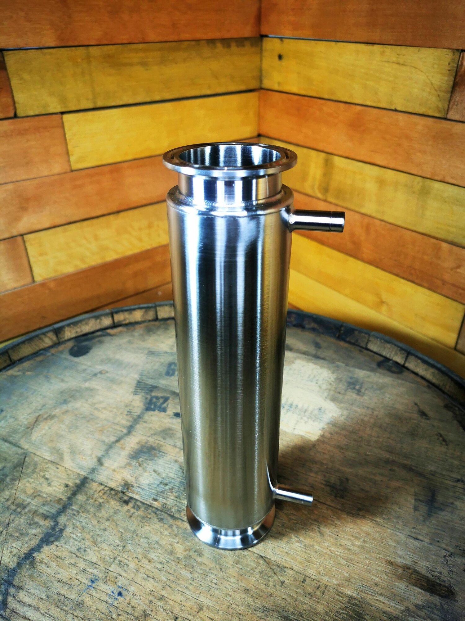 Холодильник рубашечный, разъем для подключения Clamp 2". Состоит из 2-х труб диаметром 51 мм и 63,5 мм (труба в трубе). Между трубами разного диаметра устроена "водяная рубашка" для охлаждения пара внутри царги.