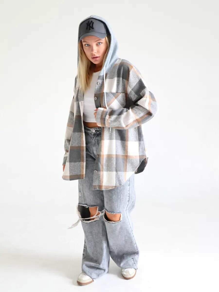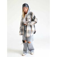 Купить Рубашка Lady Gina в клетку с капюшоном фланелевая теплая, размер 60-62, серый, белый, коричневый, золотой с доставкой по всей России.