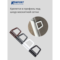 Прочные ручки из окрашенного металла для москитной сетки на пластиковое окно или дверь обеспечивают удобство эксплуатации и привлекательный внешний вид рамочной антимоскитной конструкции. Металлические ручки крепятся под шнур для сетки. Подходят для противомоскитных изделий любого типа и размера. Для замены нужно подцепить фиксирующий шнур, достать сломанную ручку, установить новую и плоским тупым предметом вставить обратно шнур в паз. Их называют «ушки». Преимущества: не подвержена коррозии, устойчива к ультрафиолету и воздействию окружающей среды, не выгорает на солнце.