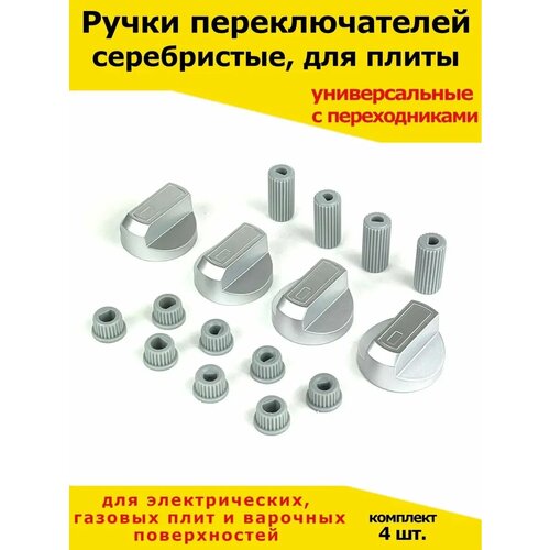 Ручки серебристые Универсальные для электрических и газовых плит комплект 4 шт с различными переходниками для всех видов плит. В комплекте 4 ручки + 12 переходников для различных переключателей от 6 мм до 8 ммПроизводители: Ariston, Ardo, Aeg, Bosch, Beko, Gorenje, Gefest, Greta, Darina, Flama, Fagor, Hansa, Indesit, Electrolux, Siemens, Zanussi, Samsung, Лысьва, Дарина, Атлант, Флама, Гефест, Индезит, Аристон, Беко, Бош, Ханса, Занусси, Электролюкс, Вирпул, Горенье.