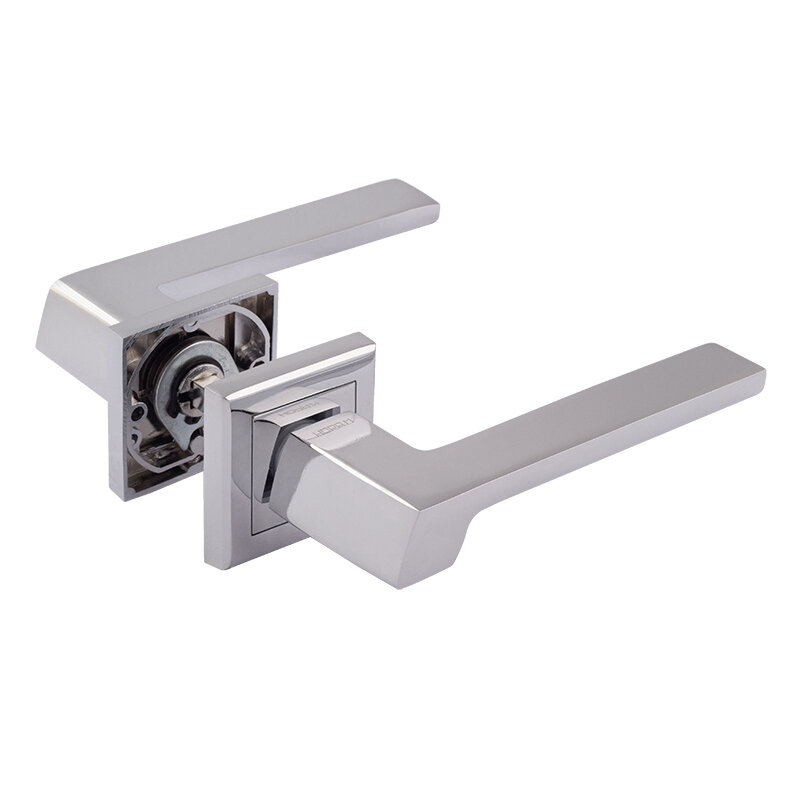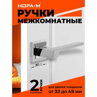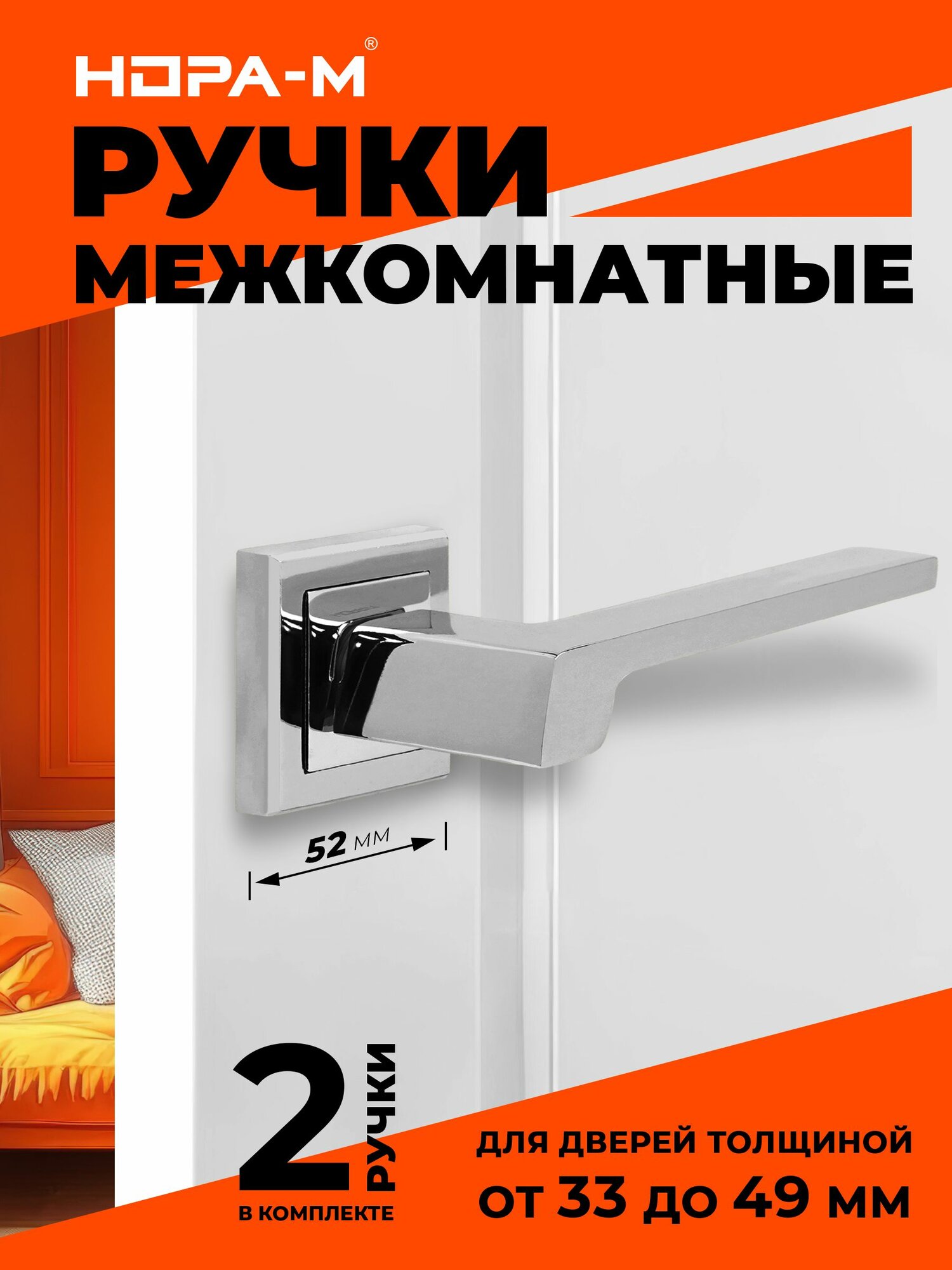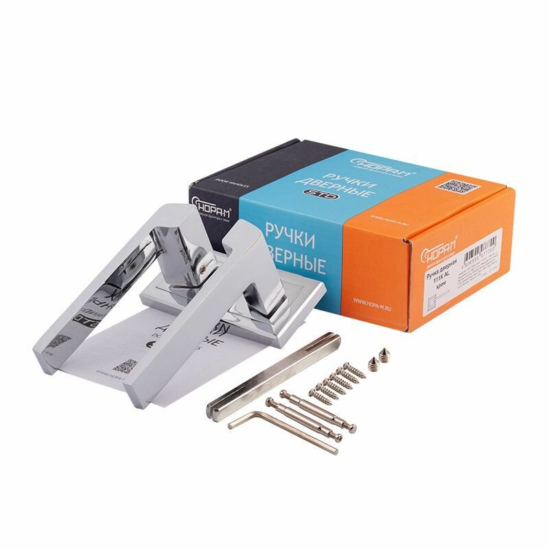 В комплекте с ручкой дверной поставляется разрезной соединительный квадрат, имеющий длину 100 мм и сечении 8*8 мм, шурупы для крепежа ручки на дверном полотне, соединительные стяжные винты, а также дополнительные винты для фиксации ручек и декоративной части розетки. Расстояние между стяжными винтами 38 мм. Дверная ручка оснащена возвратной пружиной.