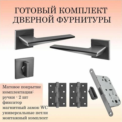 Ручка дверная межкомнатная Renz INDH_320-03_slim_MBN_MAGWC, матовый черный никель (ручка + фиксатор WC + магнитный замок + 2 универсальные петли)