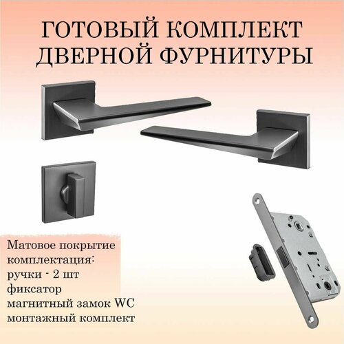 Комплект дверных ручек Renz на межкомнатную дверь - рассчитанный на одну дверь межкомнатную весом не более 40 кг: На одну дверь с магнитным замком и заверткой (фиксатор) входят следующие позиции: Дверные ручки на розетке - 2шт. (на одну дверь с 2-х сторон), шестигранный ключ, Крепеж, квадрат 8х8х105 мм Замок сантехнический межкомнатный магнитный WC - 1 шт с 2-мя отверстиями 8мм (под ручку), 6 мм (под фиксатор) Фиксатор Ренц (для запирания двери изнутри) - 1 шт, монтажный комплект к нему.