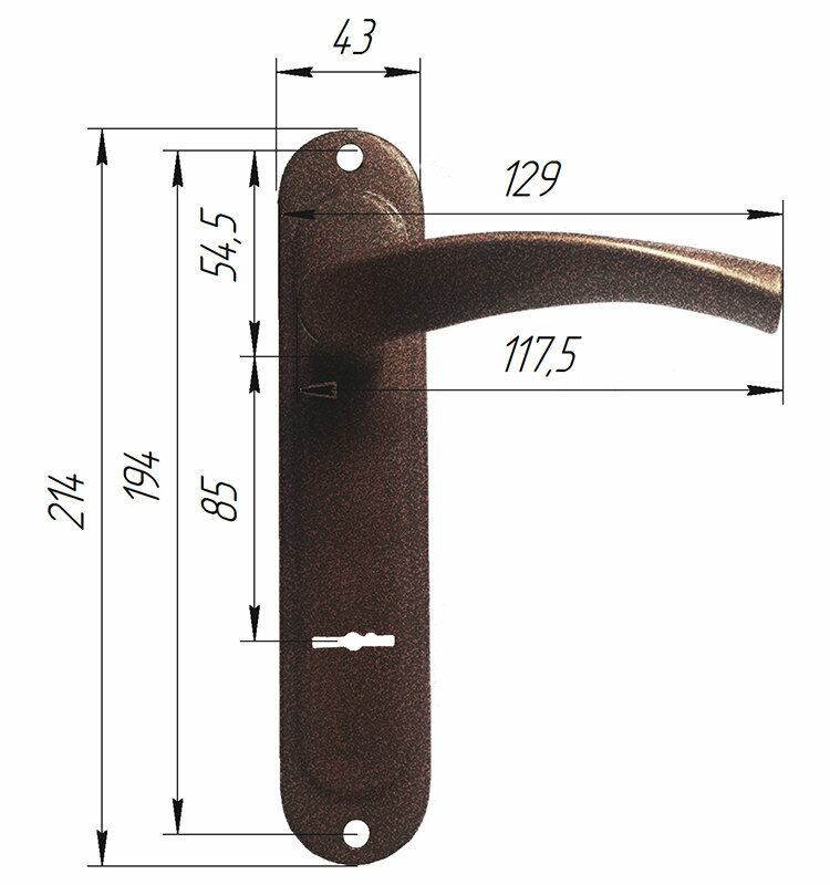 Ручка дверная на планке РДП 2-023-85С для сувальдных замков, с межосевым расстоянием 85 мм. Используется для металлических и деревянных дверей. Изготовлена из алюминиевого сплава, окрашена полимерной краской. Толщина дверного полотна - 30-35 мм.