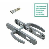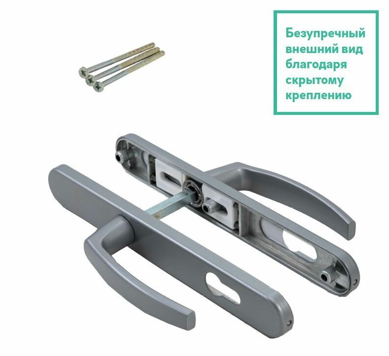 Нажимной гарнитур цвета серебро. В комплект входят штифт и три монтажных шурупа. Монтаж скрытый - в установленном виде шурупы не видны.