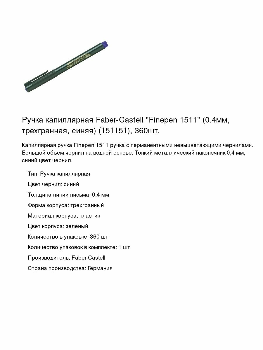 Ручка капиллярная Faber-Castell «Finepen 1511» (0.4мм, трехгранная, синяя) (151151), 360шт.: сравнение цен, характеристики, фото, актуальное наличие и цены.