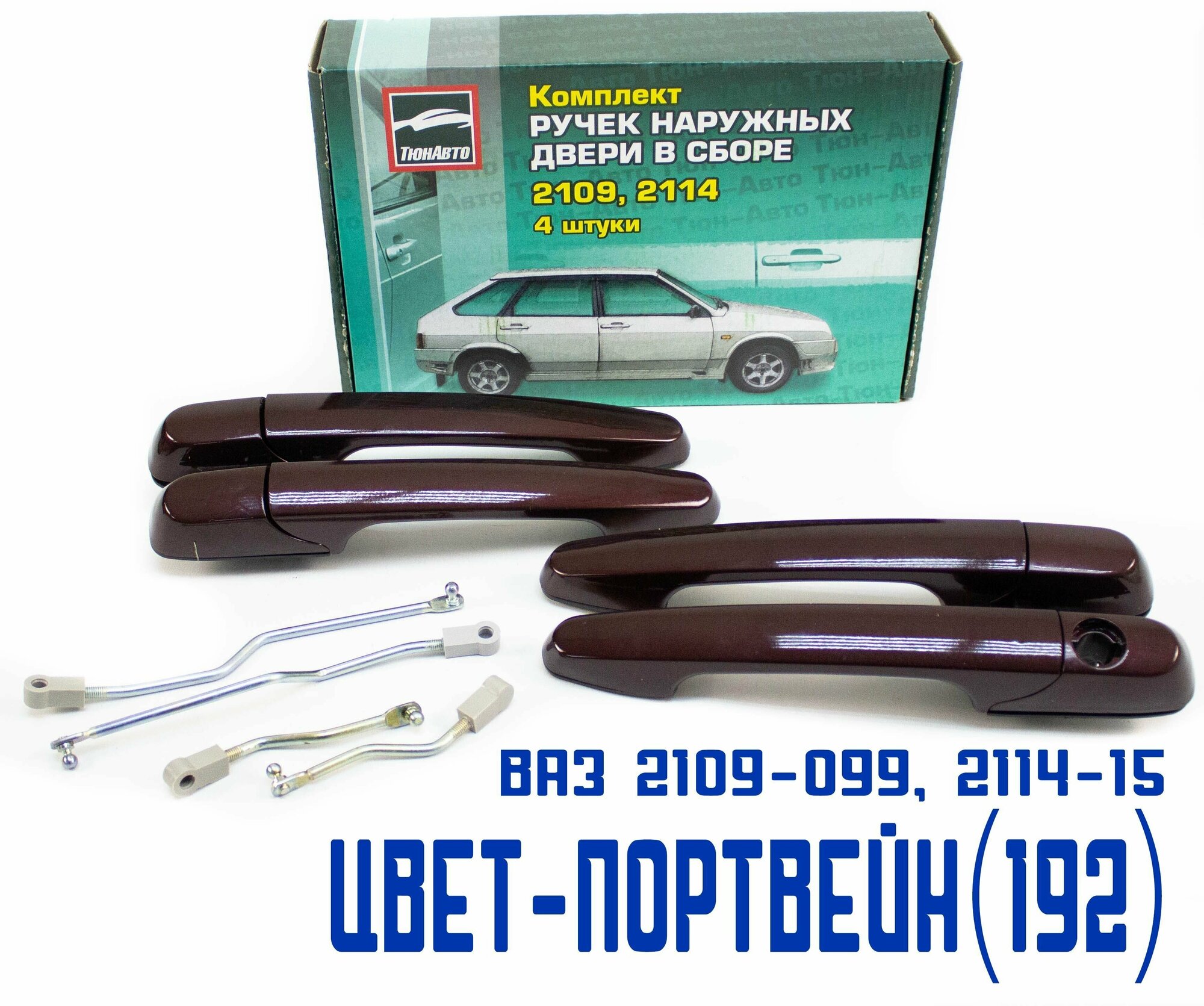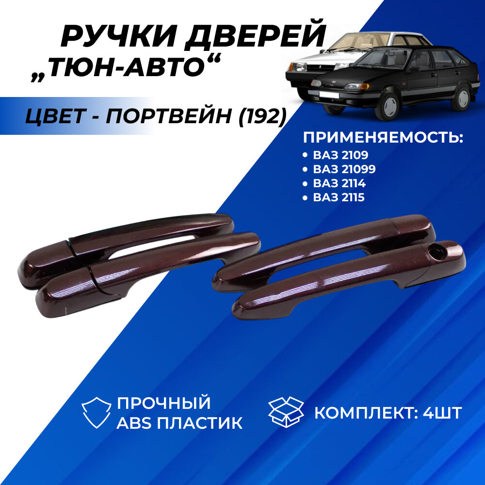 Ручки дверей ВАЗ 2114, 2109, 21099, 2115 евроручки передние задние, на левую правую сторону дверные Тюн-Авто, окрашенные в цвет Портвейн (192) евро ручки комплект 4шт. Ручки дверей ВАЗ 2114 устанавливаются на штатные места, корпус ручки для усиления крепления можно промазать герметиком, но в комплекте идут резиновые прокладки, которые устанавливаются между ручкой и дверью. Надёжное крепление ручек дверей ВАЗ 2114 гарантирует долгий срок службы. Ручки дверей ВАЗ 2114 улучшают внешний вид автомобиля по сравнению со штатными ручками. Установка ручек дверей ВАЗ 2114 не требует особых усилий и навыков.