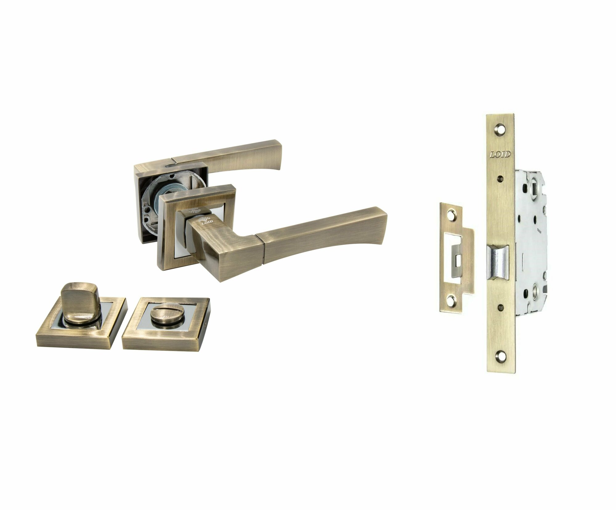 Ручка дверная межкомнатная с защелкой и фиксатором, античная бронза Loid 167 AB + замок M-2055 B AB + завертка квадратная AB: сравнение цен, характеристики, фото, актуальное наличие и цены.