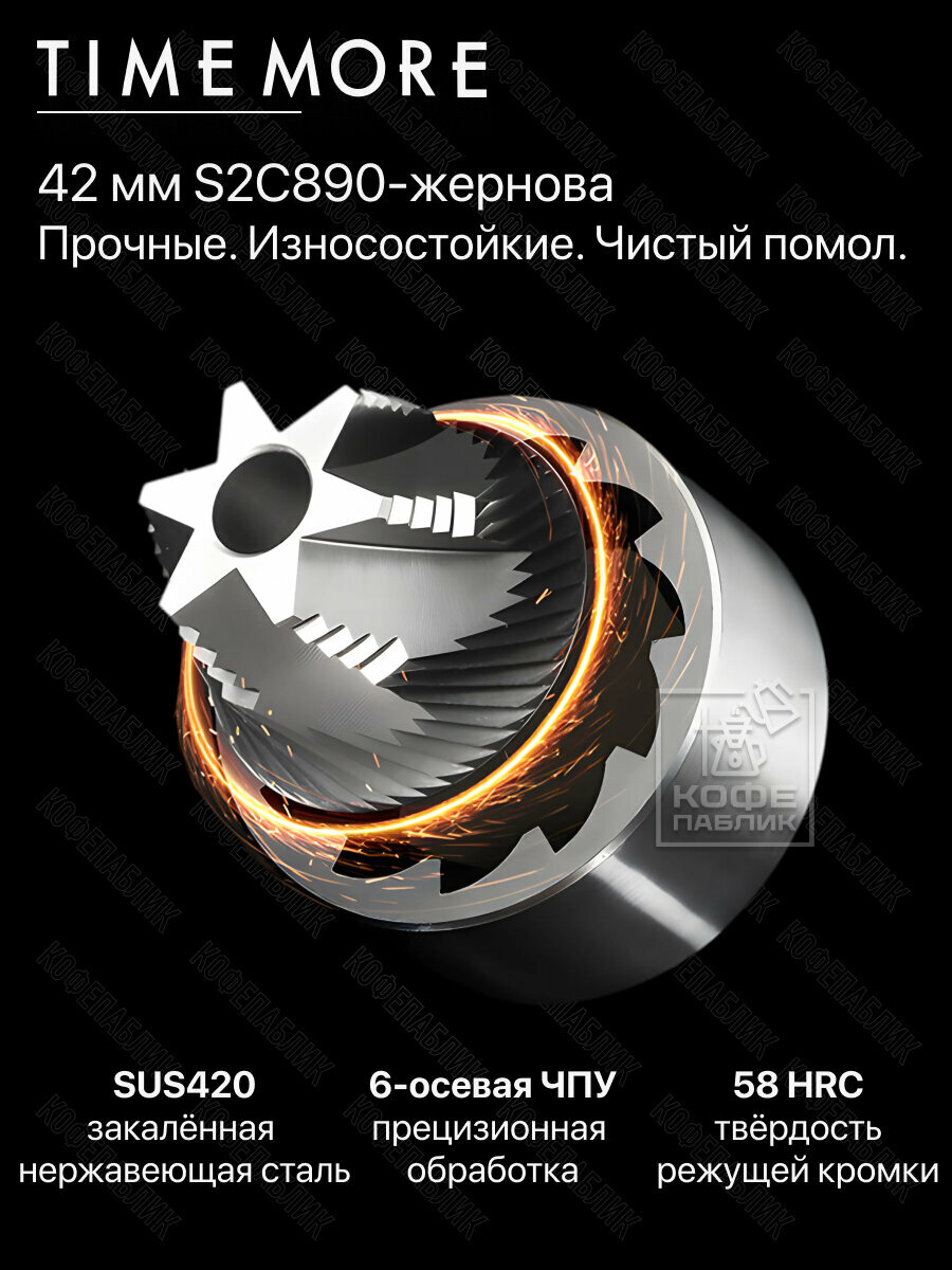 Запатентованные стальные жернова S2C890: Обеспечивают быстрый и постоянный помол зёрен, изготовлены из высокоуглеродистой нержавеющей стали SUS420, устойчивой к износу и ржавчине. Твёрдость стали: 58,5-60 HRC.